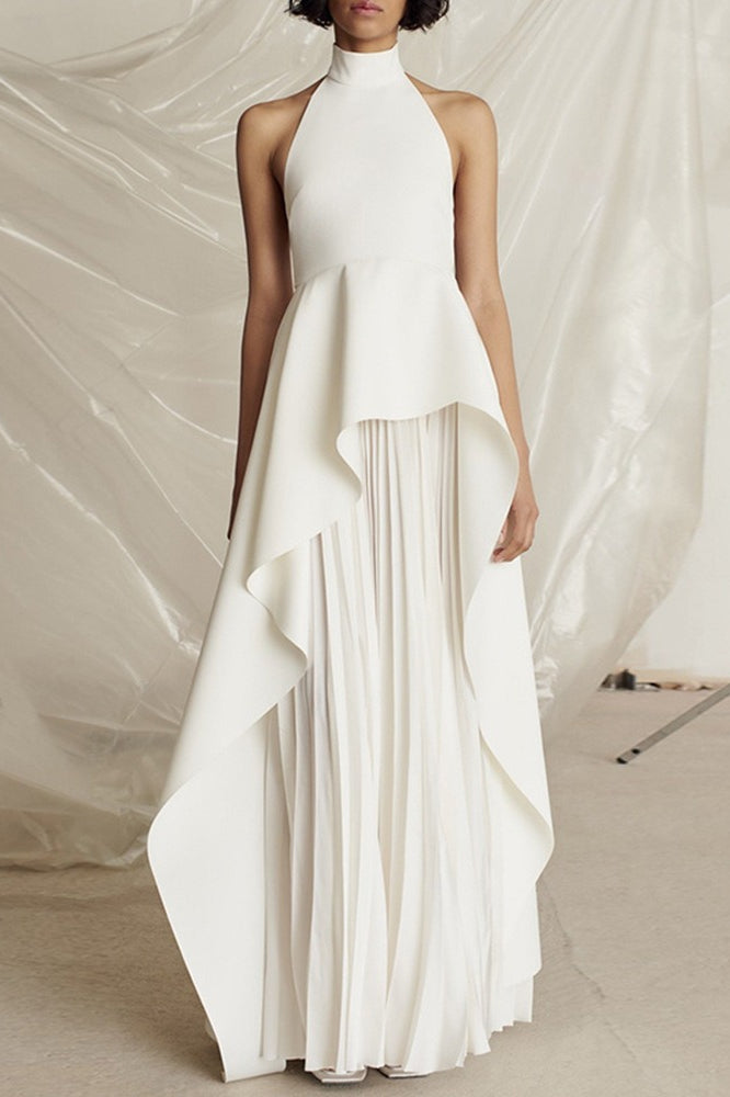 Halter Black White Contrast Pleated Prom Dress