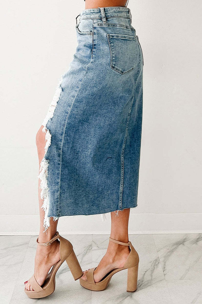 • Clothing Type: Denim Skirt • Skirt Length: Midi • Composition: Cotton, Polyester • Details: Distressed