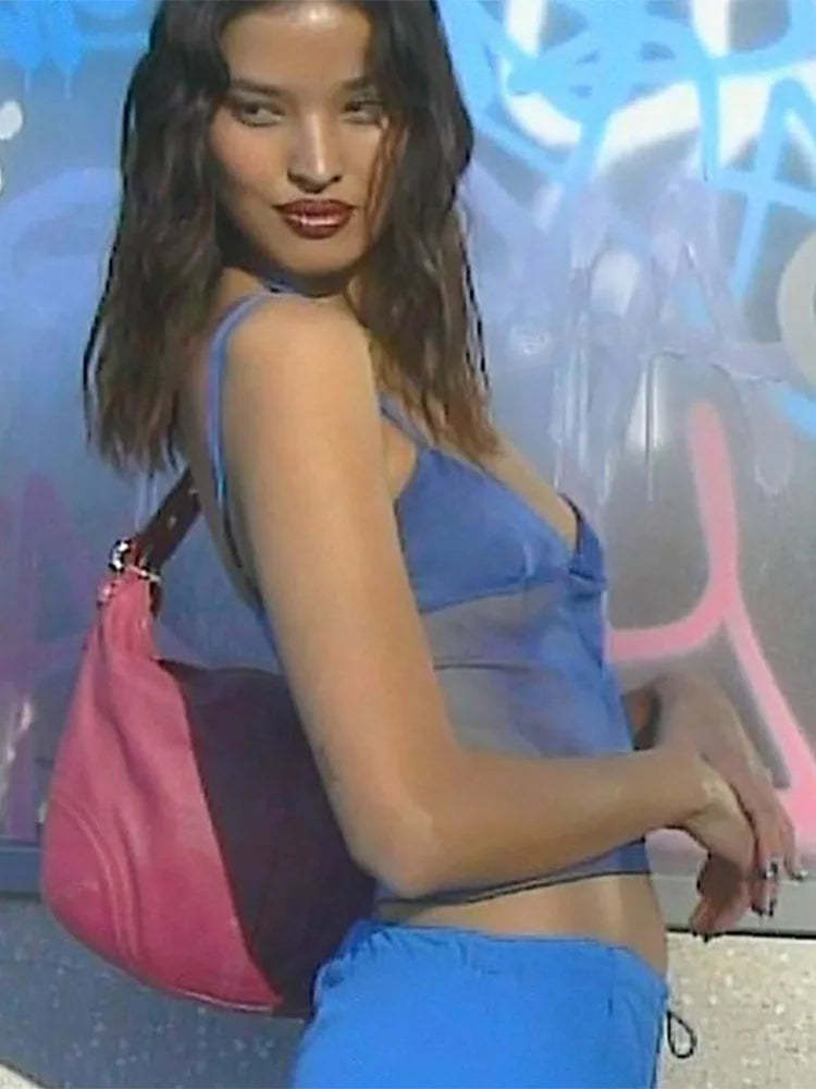 Blue Mesh Halter Crop Top