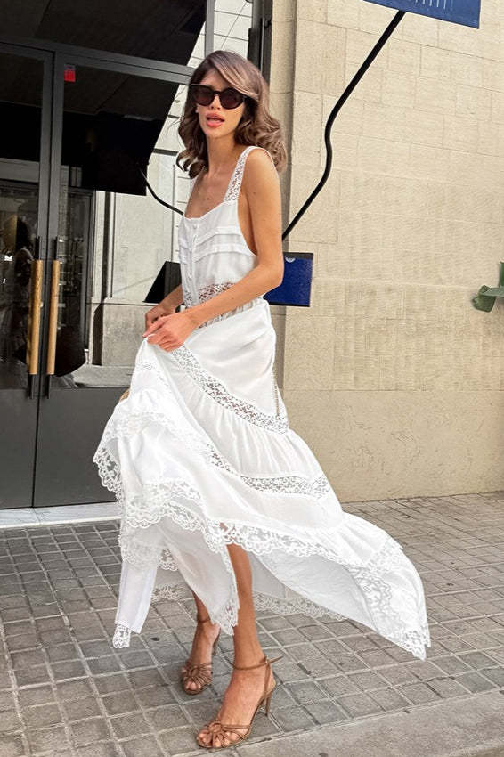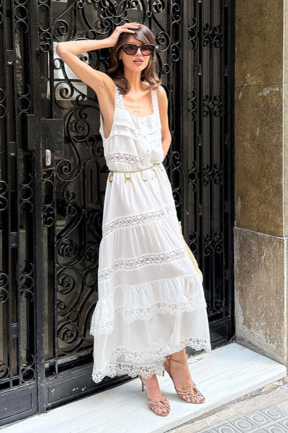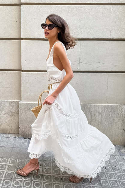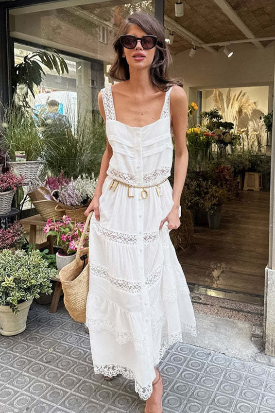 • Fit: Slim Fit • Clothing Type: A-line Dress • Dress Length: Maxi • Waist Type: High Waist • Neckline: Square Neck • Composition: Polyester, Spandex • Details: Lace, Jacquard Maxi Dress