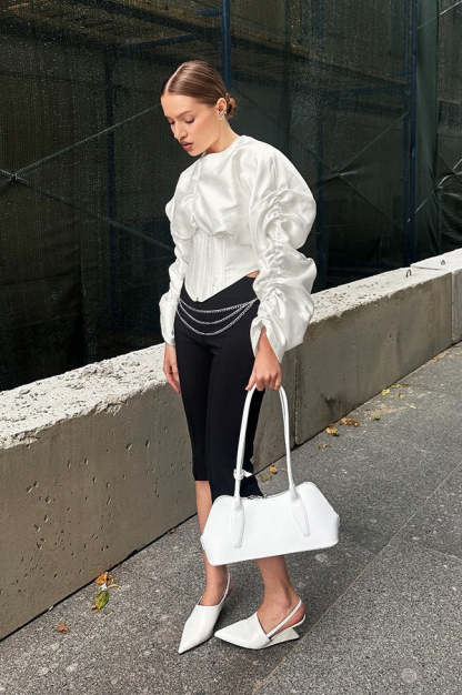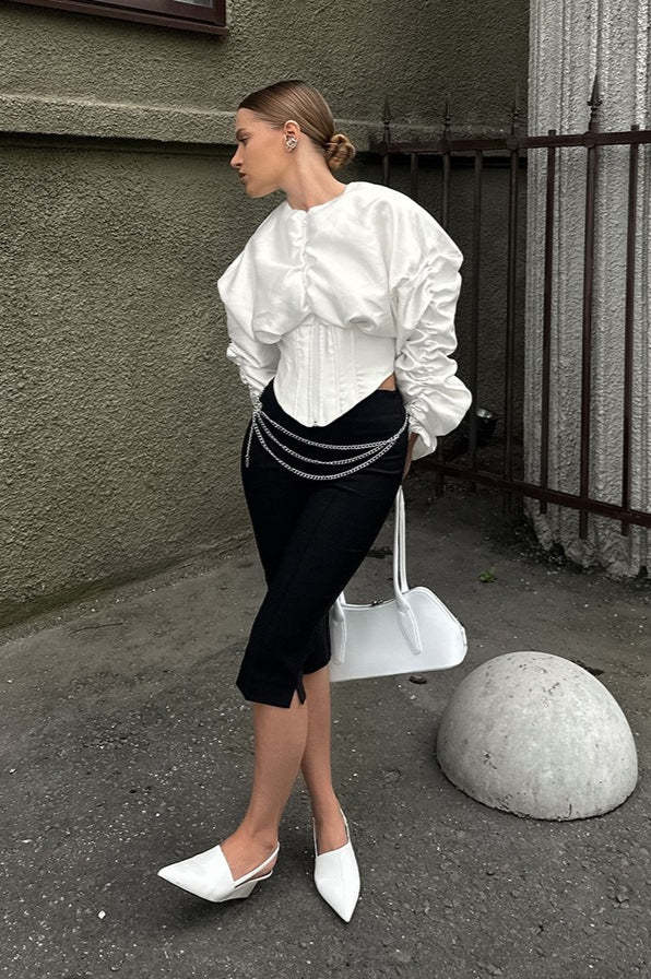 • Fit: Fitted Waist Fit • Neckline: Turtleneck Collar • Sleeve Length: Long Sleeve • Sleeve Type: Puff sleeve • Details: Zipper • Composition: Polyester, Spandex