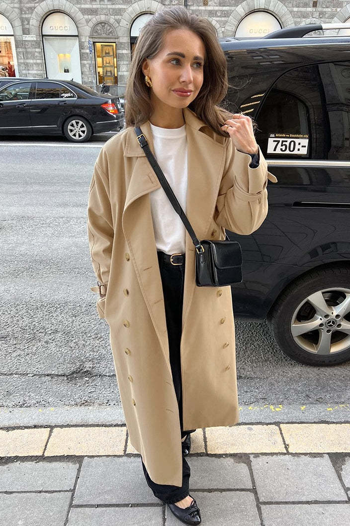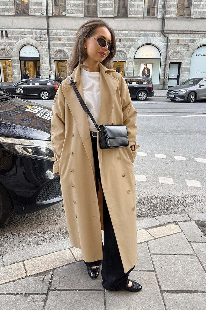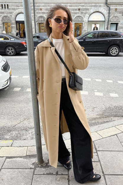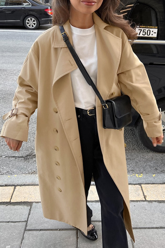 • Fit: Loose Fit • Neckline: Lapel Collar • Sleeve Type: Drop Shoulder Sleeve • Sleeve Length: Long Sleeve • Details: Trench Coat • Composition: Viscose, Coolmax, T400