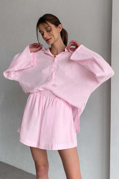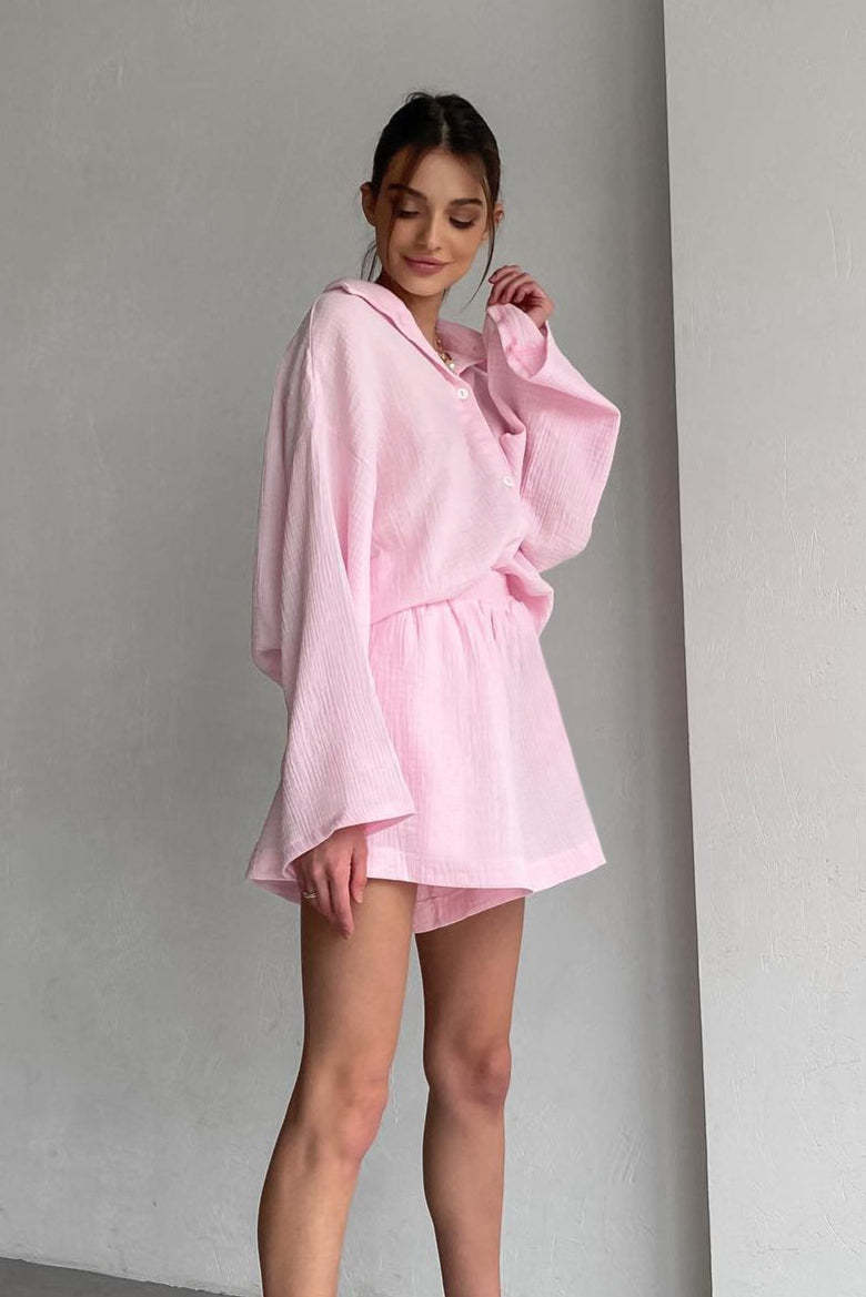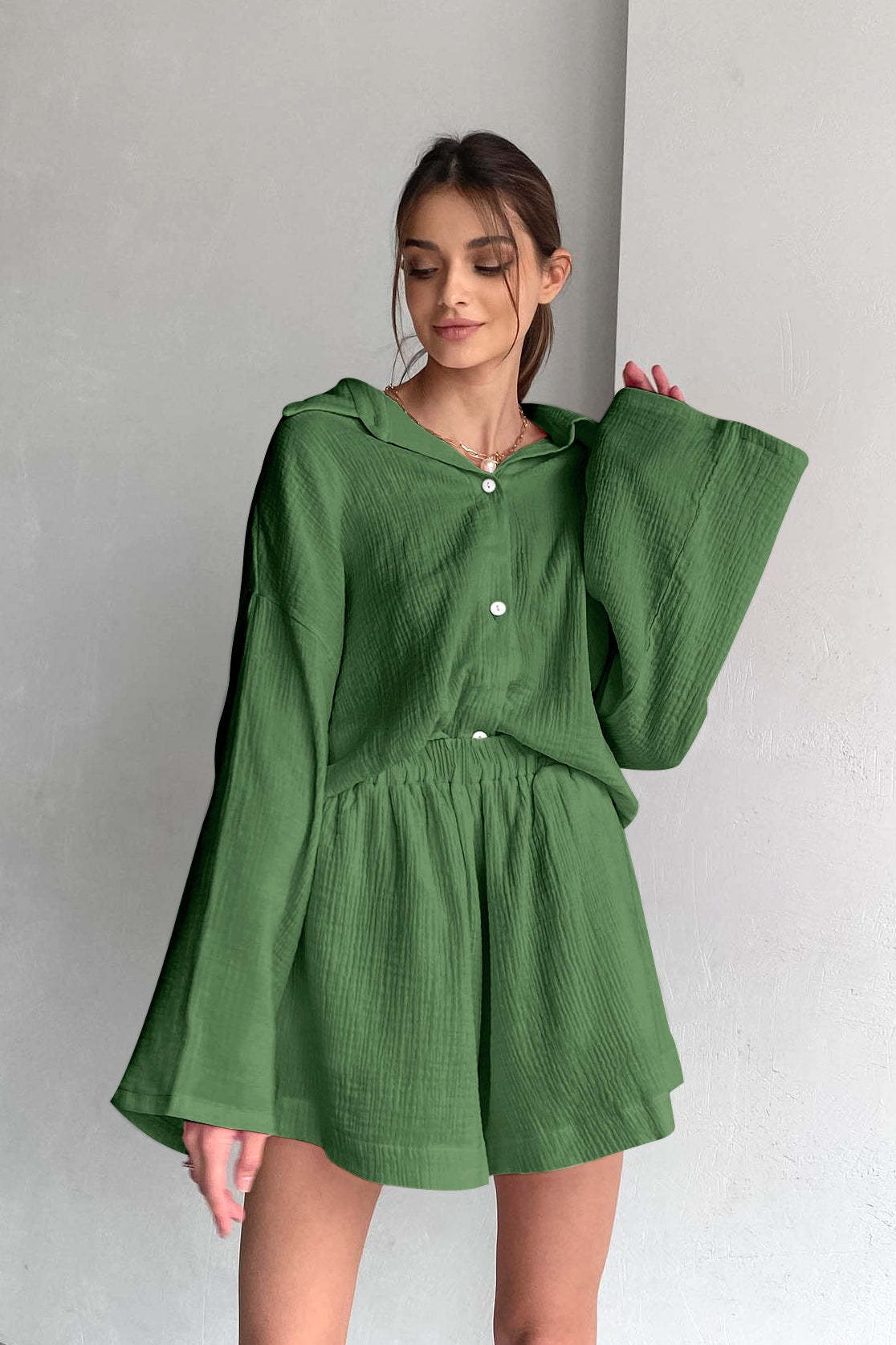 Cotton Long Sleeve Shirt Wide Leg Pants Two Piece Set