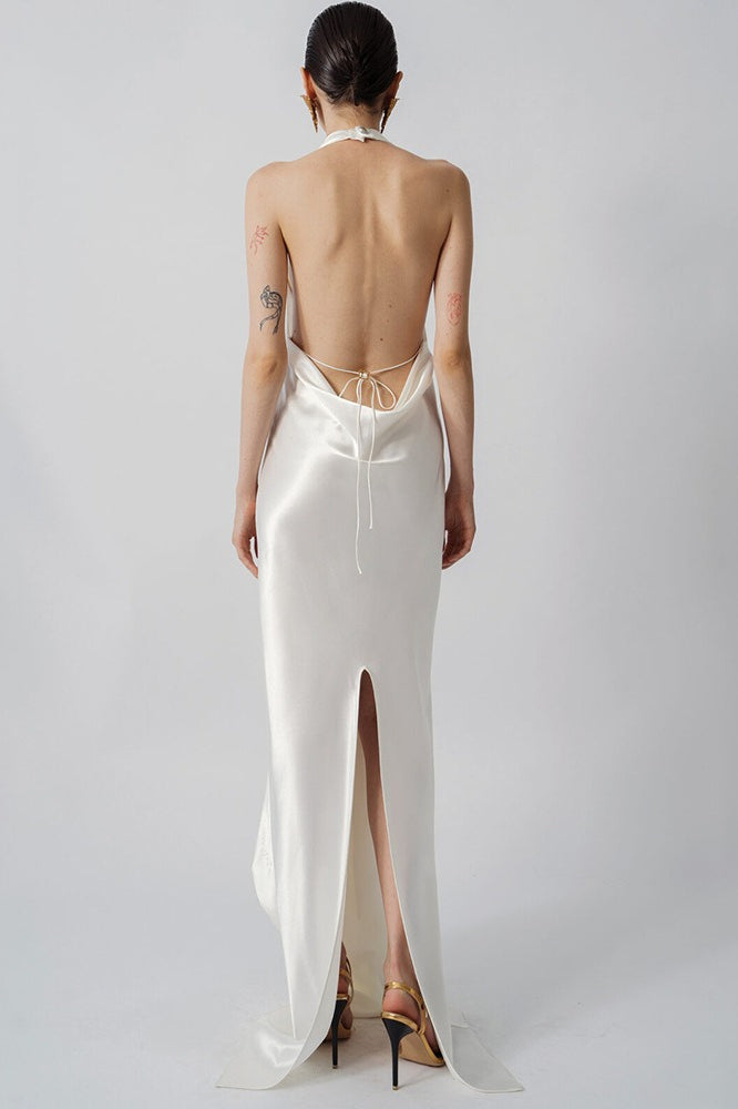 • Clothing Type: A-line Dress • Dress Length: Maxi • Waist Type: High Waist • Neckline: V-Neck • Details: Backless • Composition: Polyester, Satin