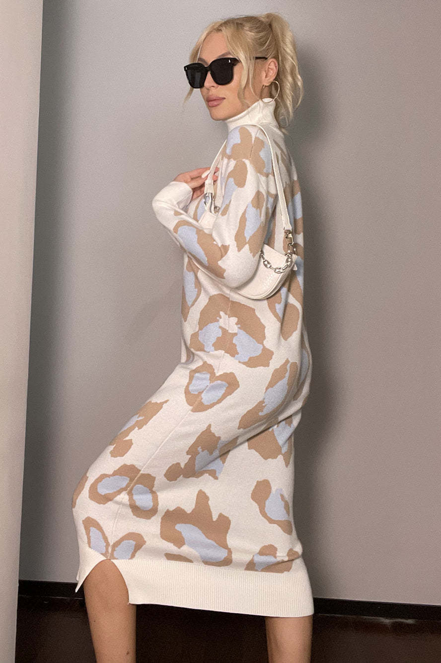 Elegant Leopard Turtleneck Sweater Maxi Dress