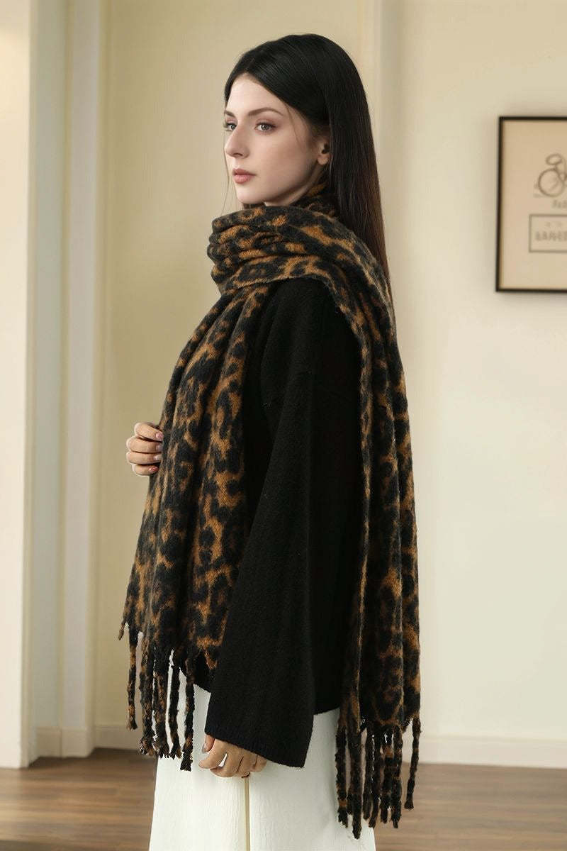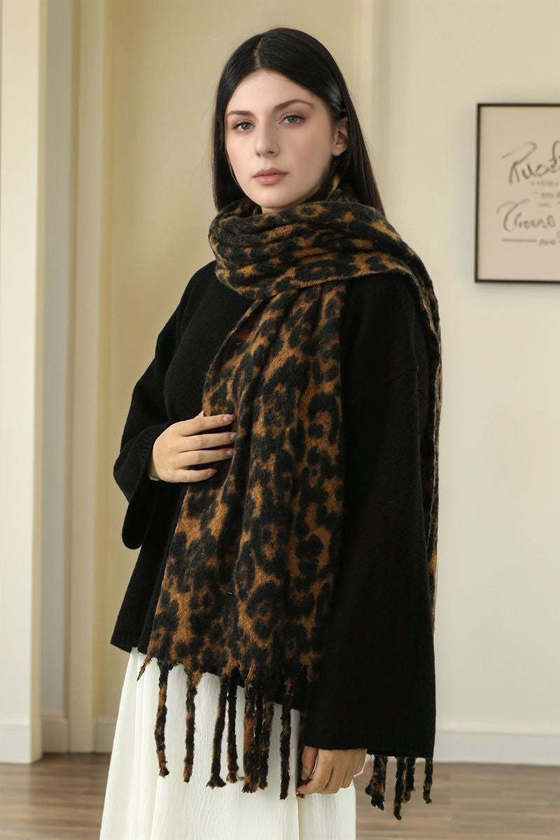• Length: Mid-length • Composition: Cashmere-like Fabric • Craftsmanship: Satin Stripe • Knitting Method: Warp Knitting • Style: Bohemian • Function: Warmth • Details: Tassels Scarf