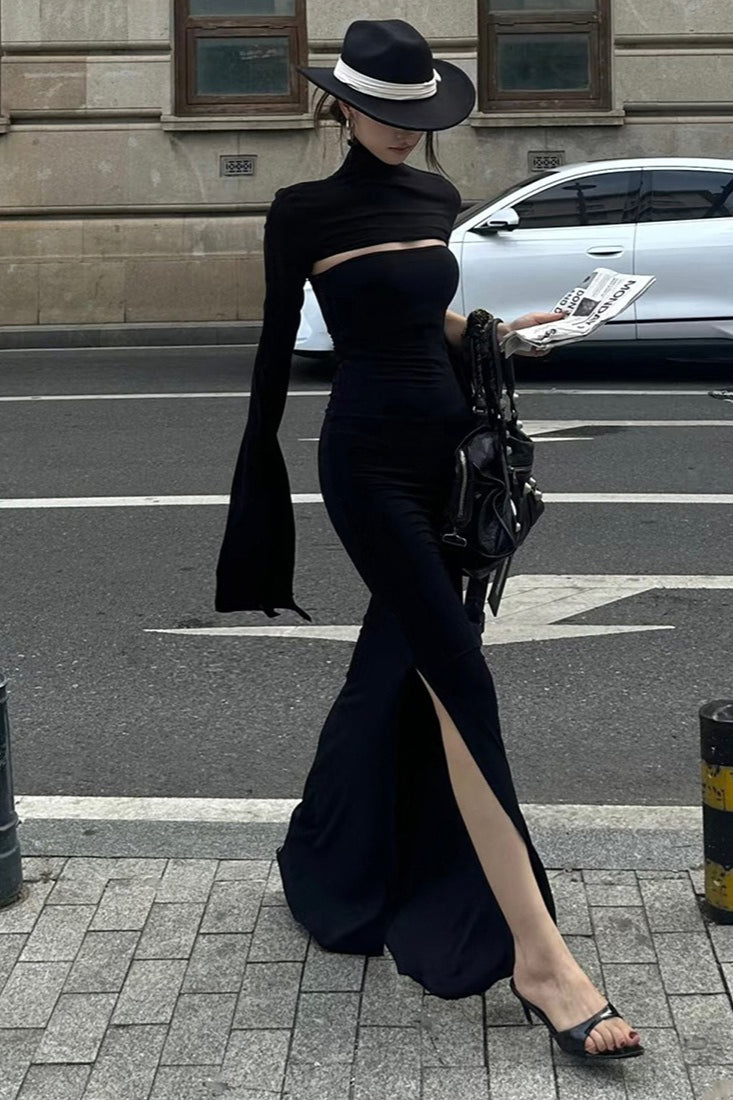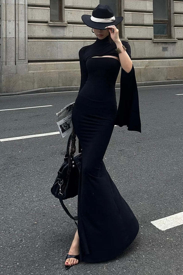 • Skirt Length: Long Skirt • Skirt Silhouette: Asymmetrical Skirt • Waist Type: High Waist • Collar Type: Mock Neck (Semi-High Neck) • Sleeve Length: Long Sleeve • Sleeve Type: Regular Sleeve • Fashion Element: Solid Color • Fabric Composition: Polyester, Spandex (Elastane)