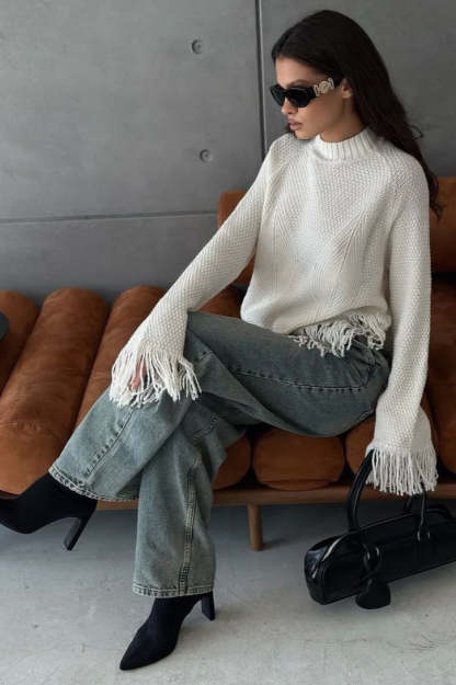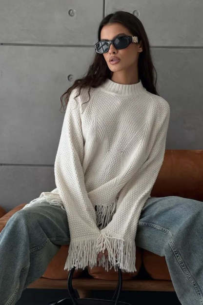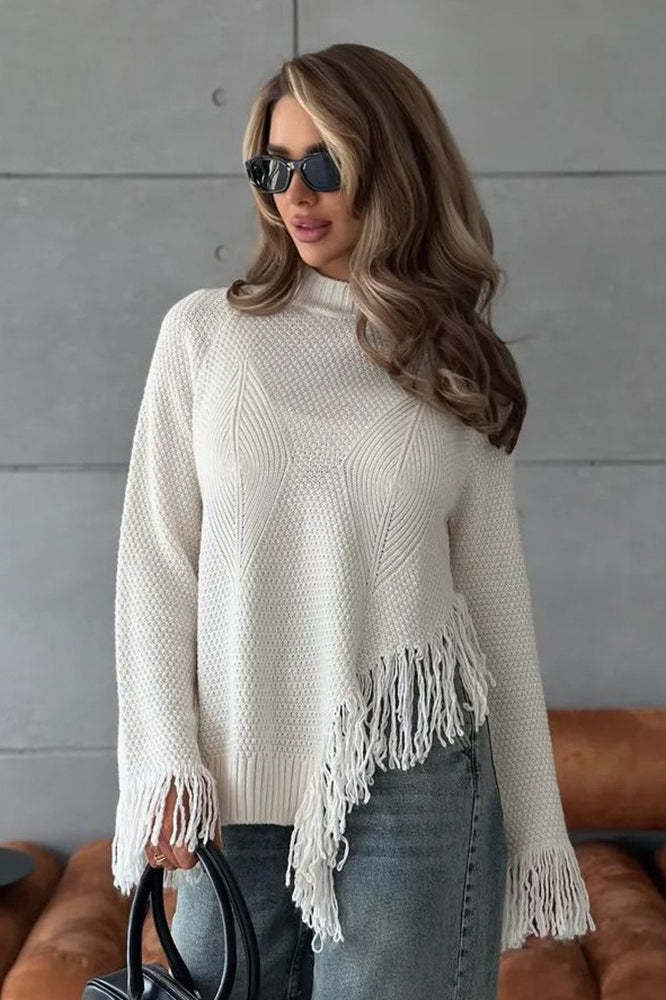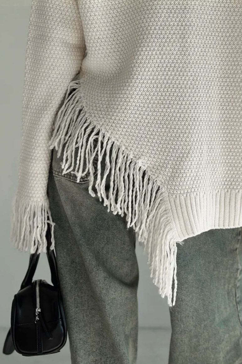 • Fit: Loose Fit • Neckline: Round Neck • Sleeve Length: Long Sleeve • Sleeve Type: Regular sleeve • Details: Irregular Hem, Fringe • Composition: Cotton, Polyester