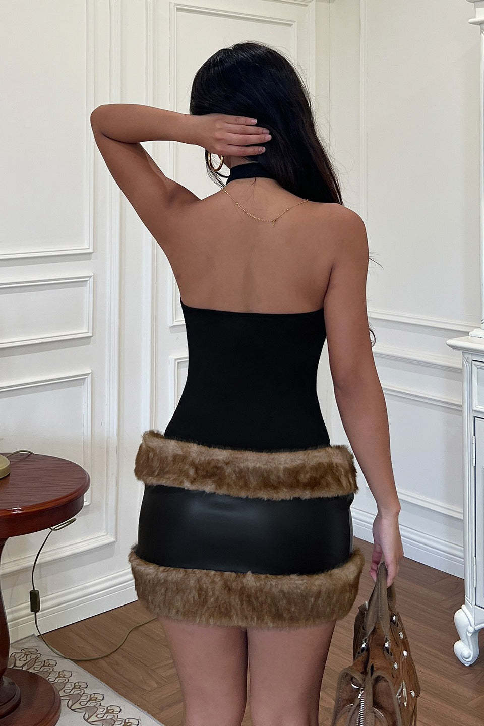 • Clothing Type: Bodycon Dress • Dress Length: Mini • Waist Type: High Waist • Neckline: Halter Neck • Sleeve Type: Sleeveless • Sleeve Length: Sleeveless • Composition: Polyester, Spandex • Details: Solid Color, Patchwork