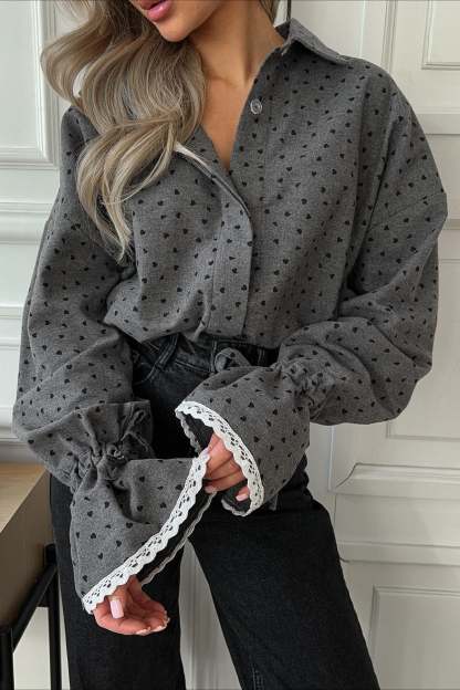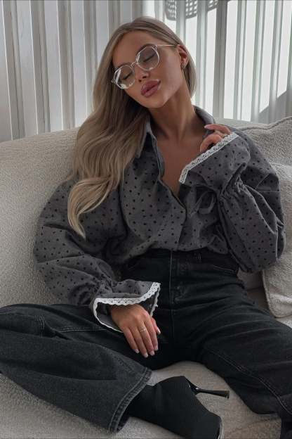 • Fit: Loose Fit • Neckline: Lapel Collar • Sleeve Length: Long Sleeve • Sleeve Type: Shirt Sleeve • Details: Lace, Pleats • Composition: Cotton