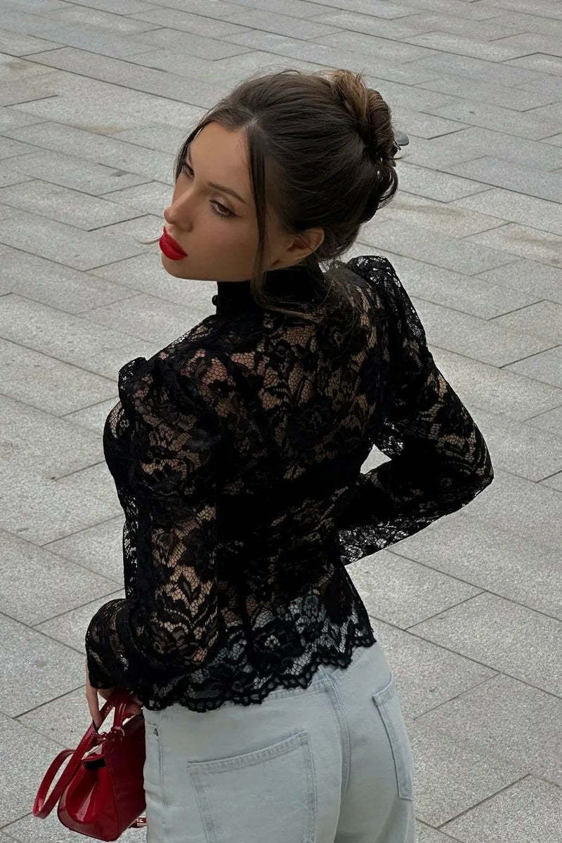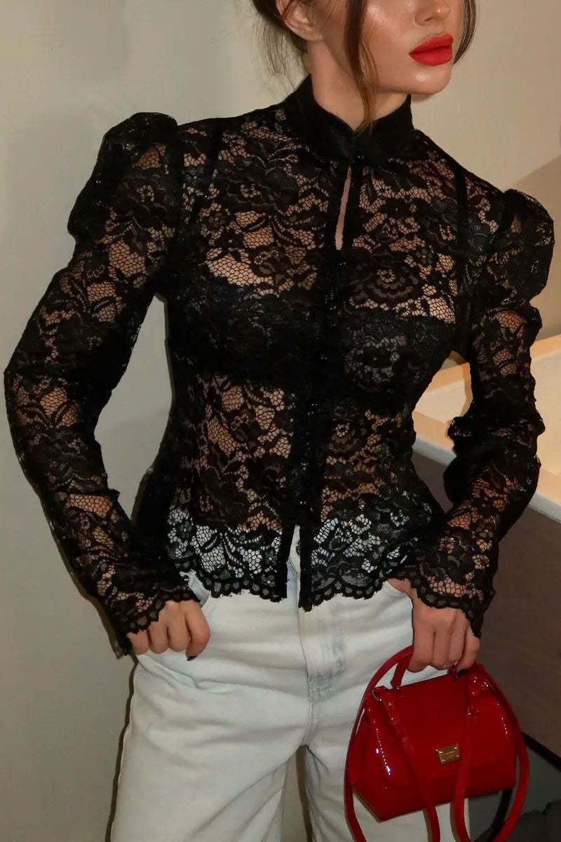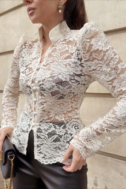 • Fit: Slim Fit • Neckline: Stand Collar • Sleeve Type: Puff sleeve • Sleeve Length: Long Sleeve • Details: Lace • Composition: Cotton, Polyester