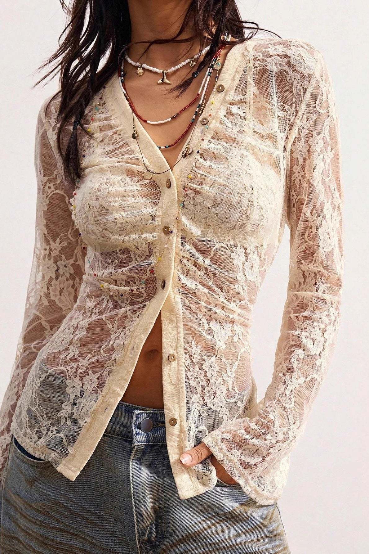 • Fit: Slim Fit • Neckline: V-Neck • Sleeve Length: Long Sleeve • Sleeve Type: Flare sleeve / Trumpet sleeve • Details: Lace • Composition: Nylon, Spandex
