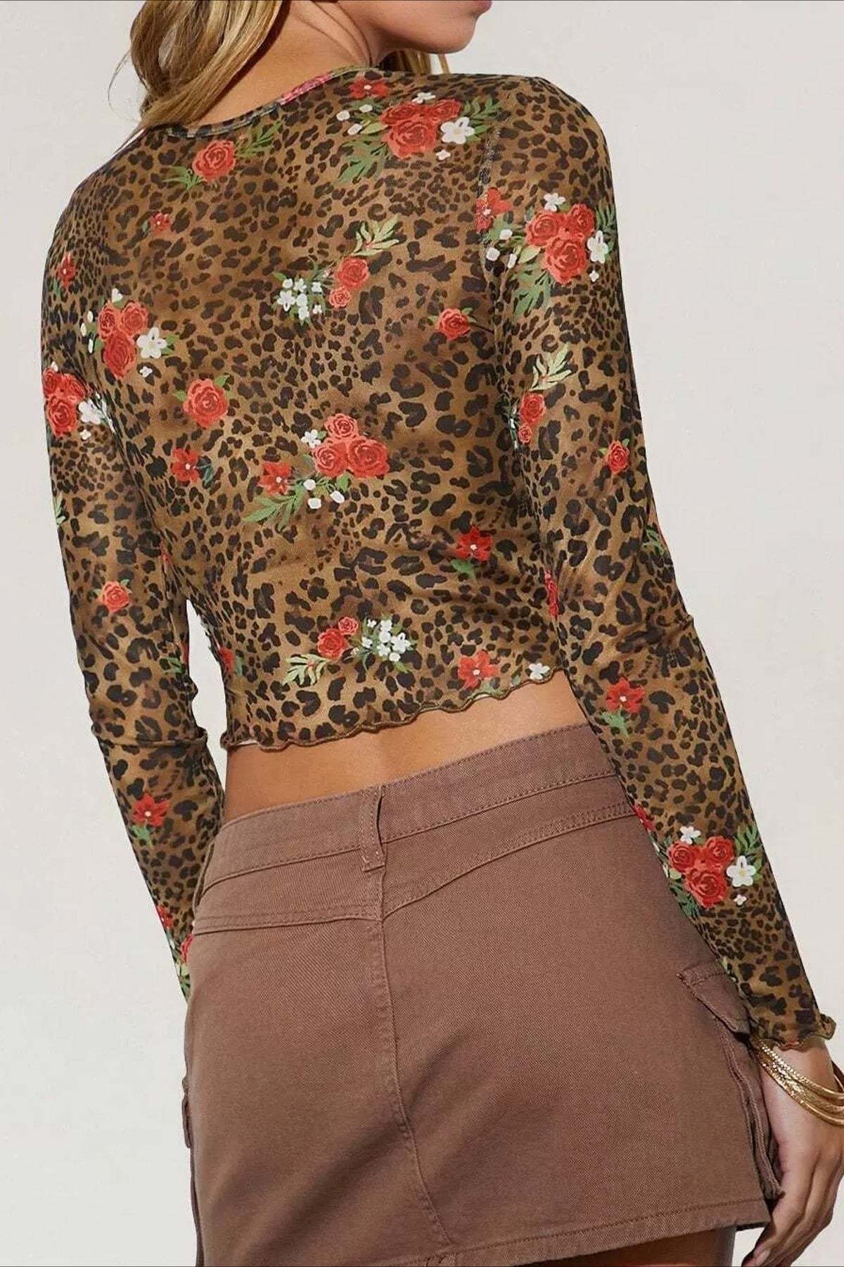 Leopard Floral Mesh Long Sleeve Crop Top