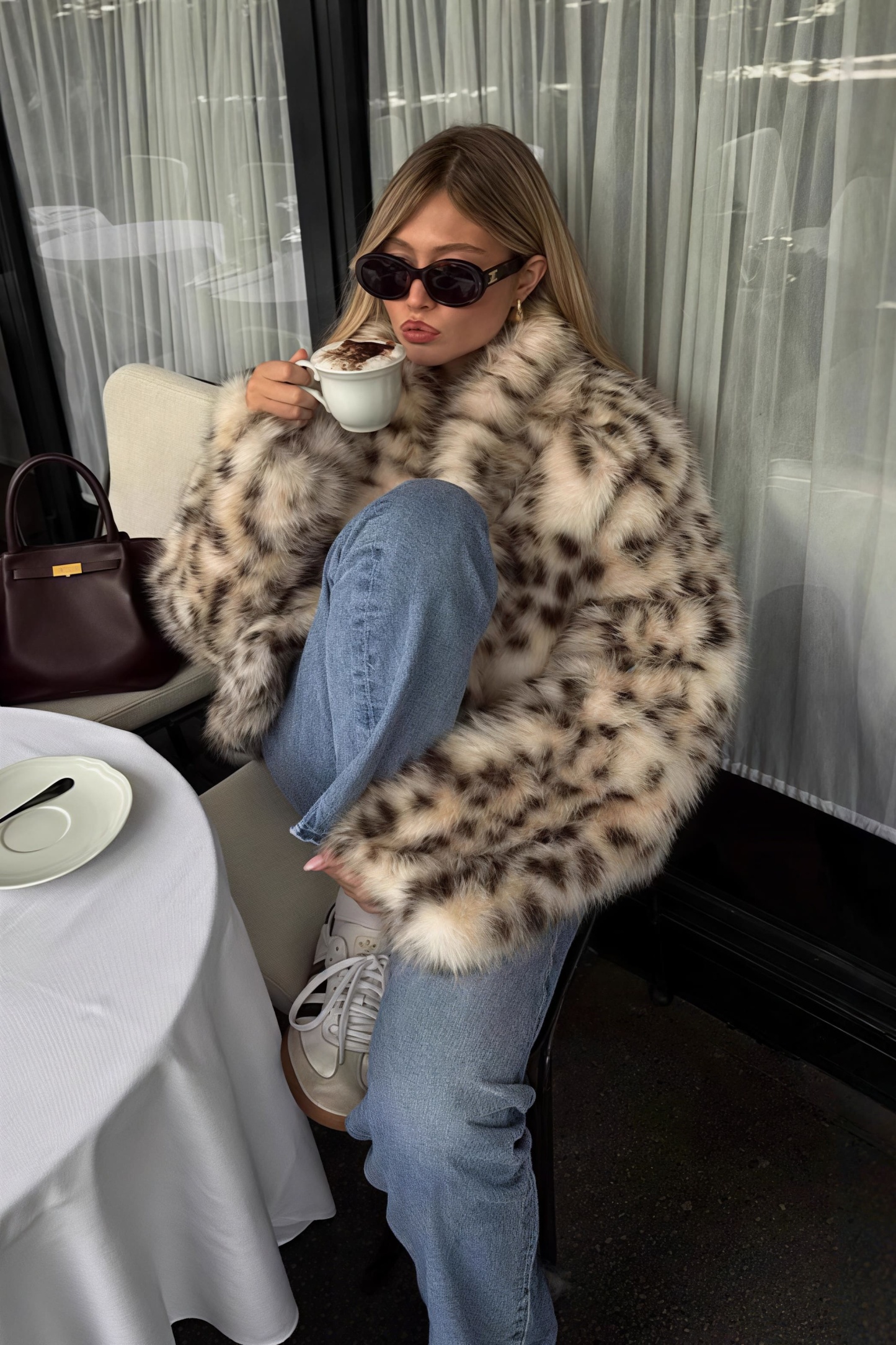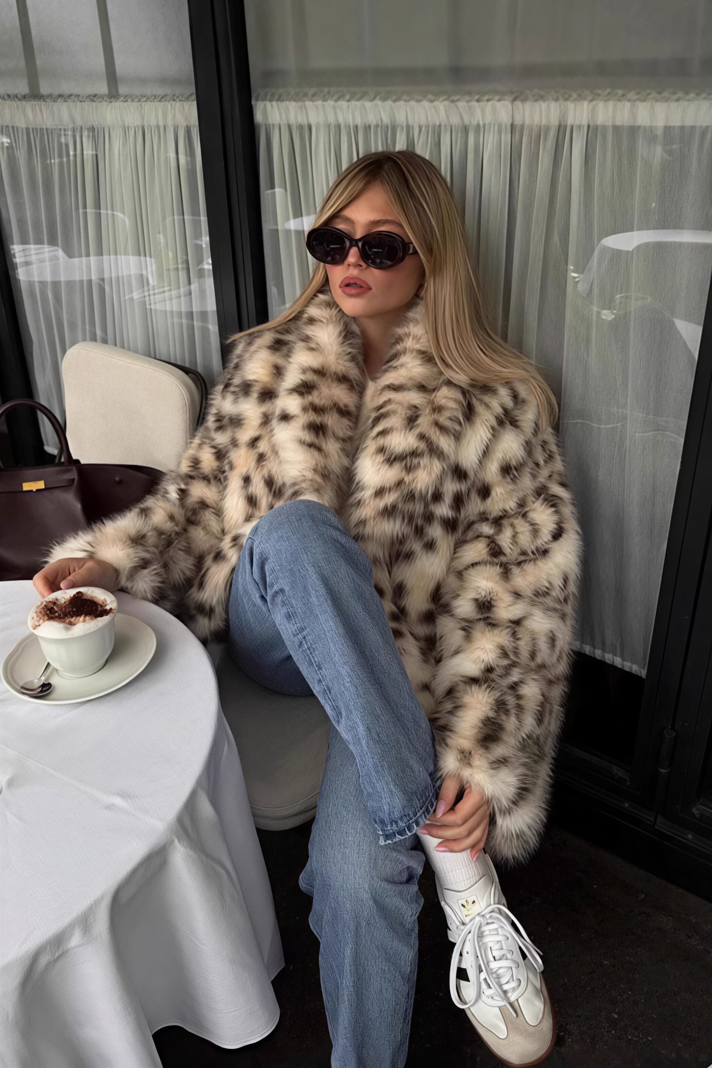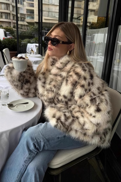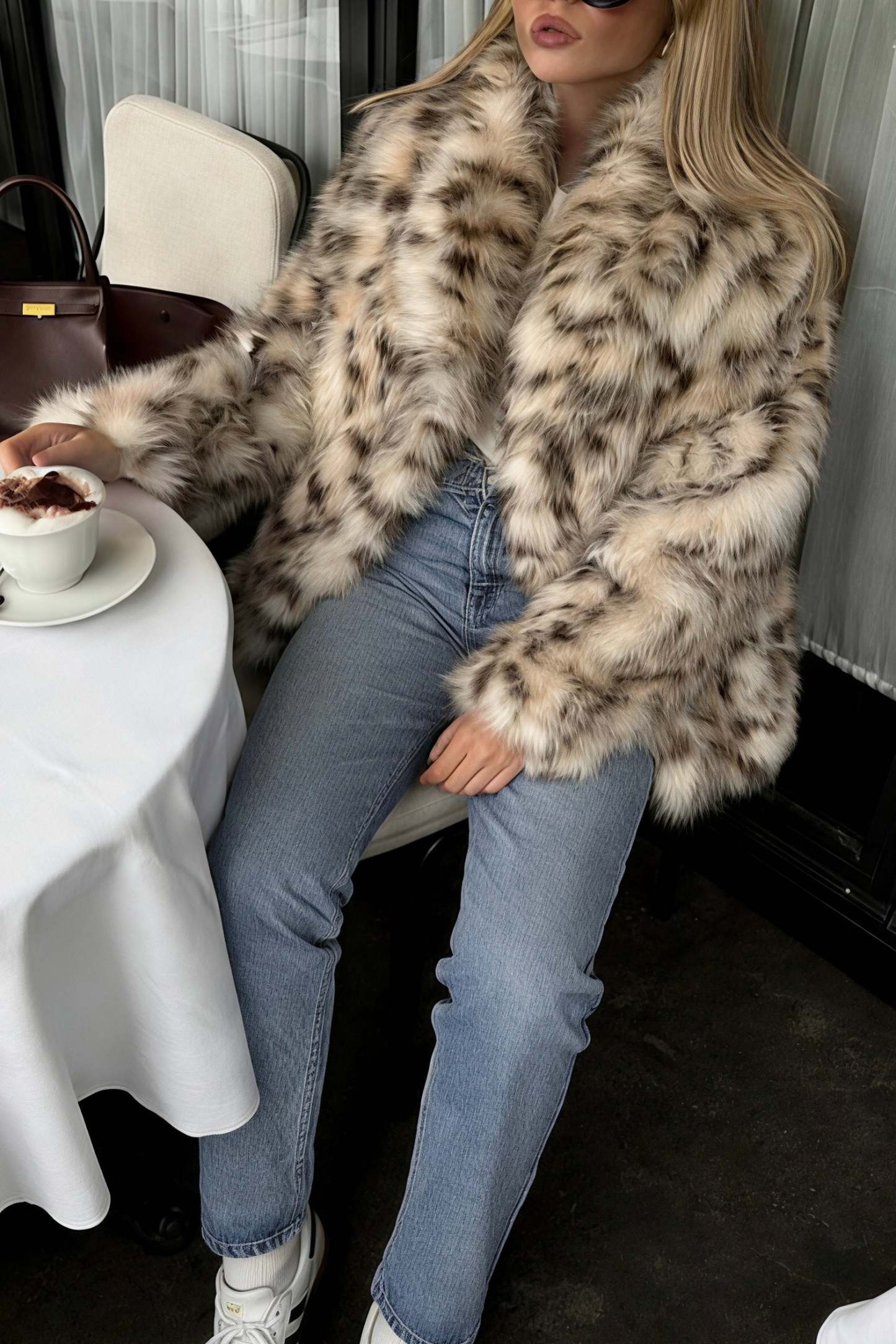 • Neckline: Lapel Collar • Sleeve Type: Regular sleeve • Sleeve Length: Long Sleeve • Composition: Faux Fur • Details: Leopard Print