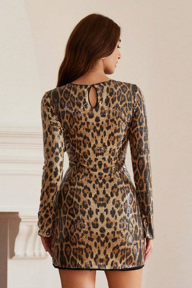 • Clothing Type: Bodycon Dress • Dress Length: Mini • Waist Type: Mid Waist • Neckline: Crew Neck • Sleeve Type: Regular sleeve • Sleeve Length: Long Sleeve • Details: Leopard Print • Composition: Sequin