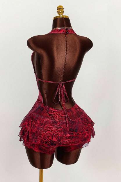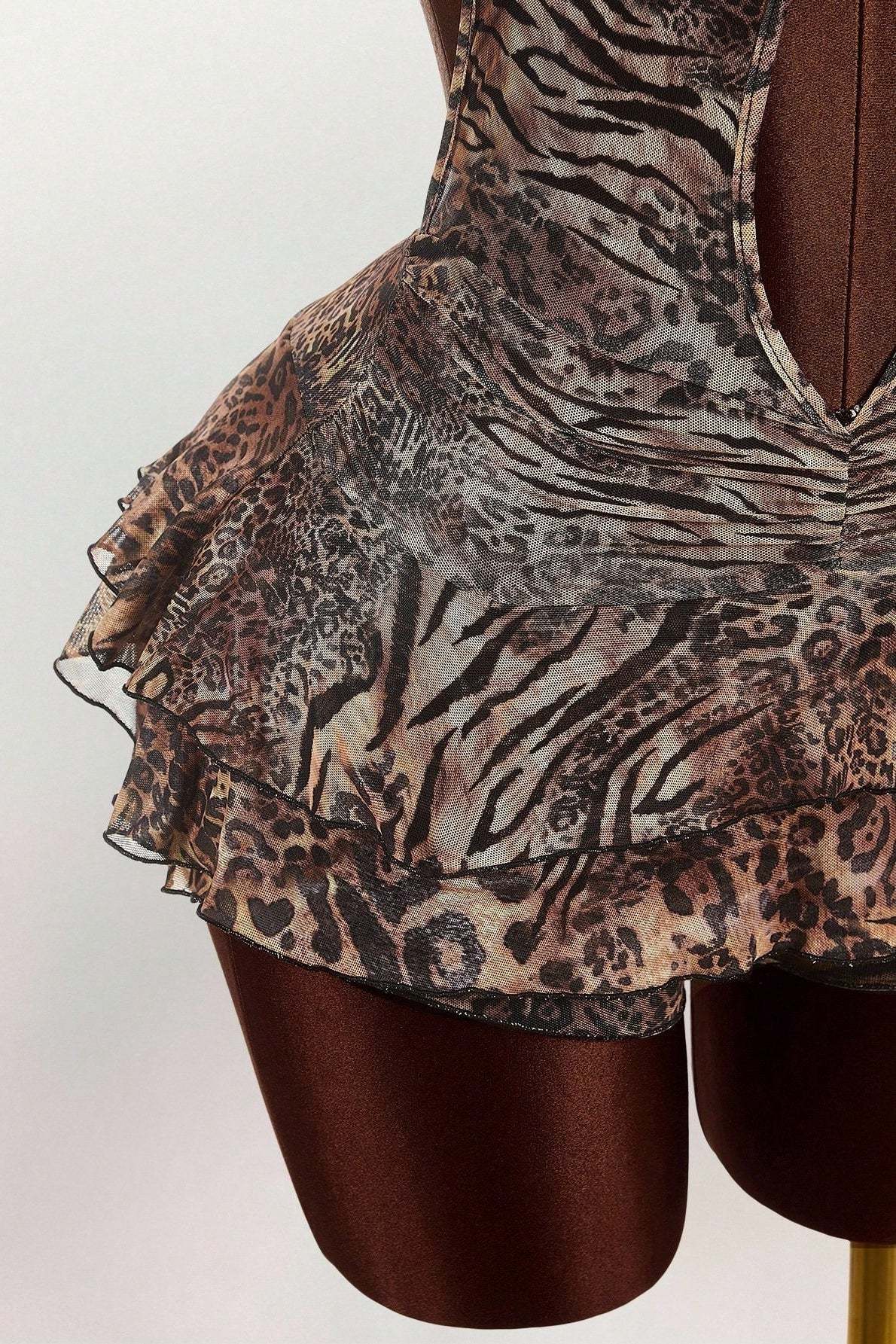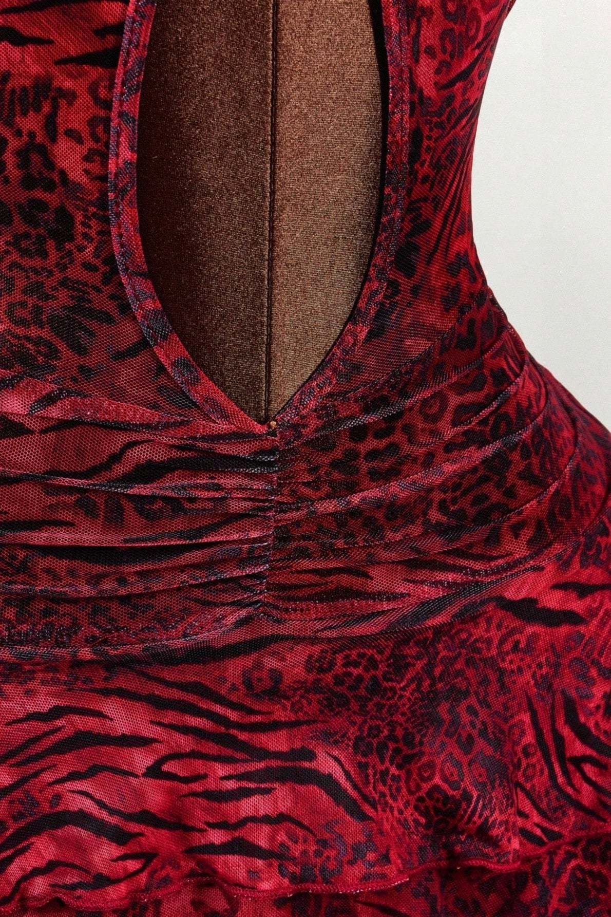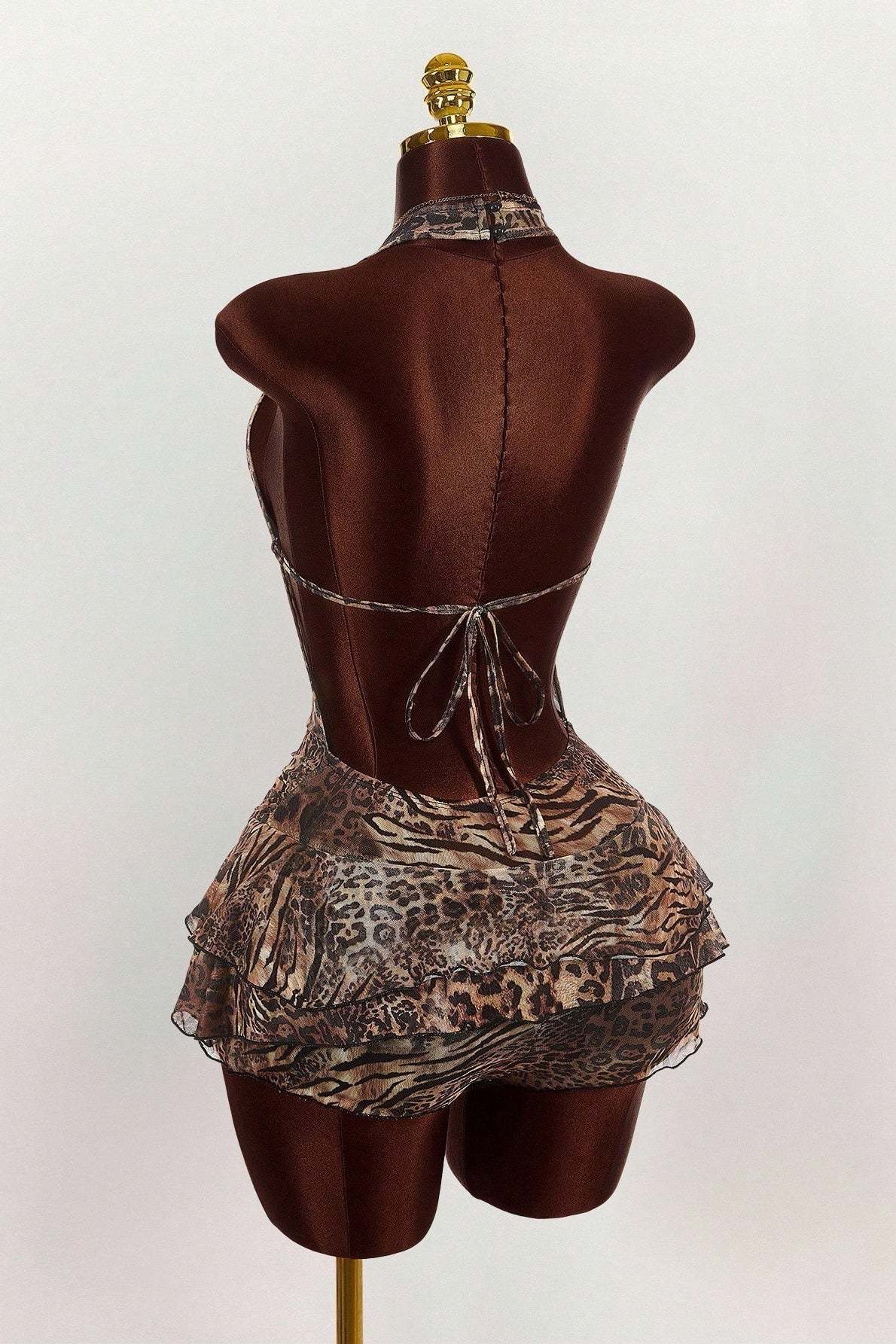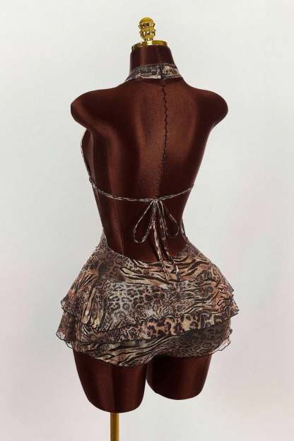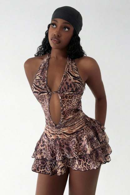 • Clothing Type: Tiered Dress • Dress Length: Mini • Waist Type: Mid Waist • Neckline: Low Neck • Composition: Polyester, Spandex • Details: Leopard Print