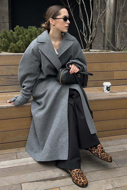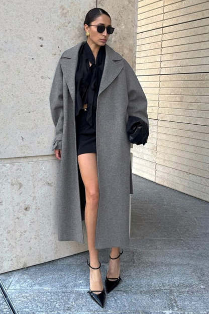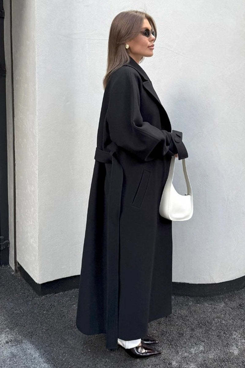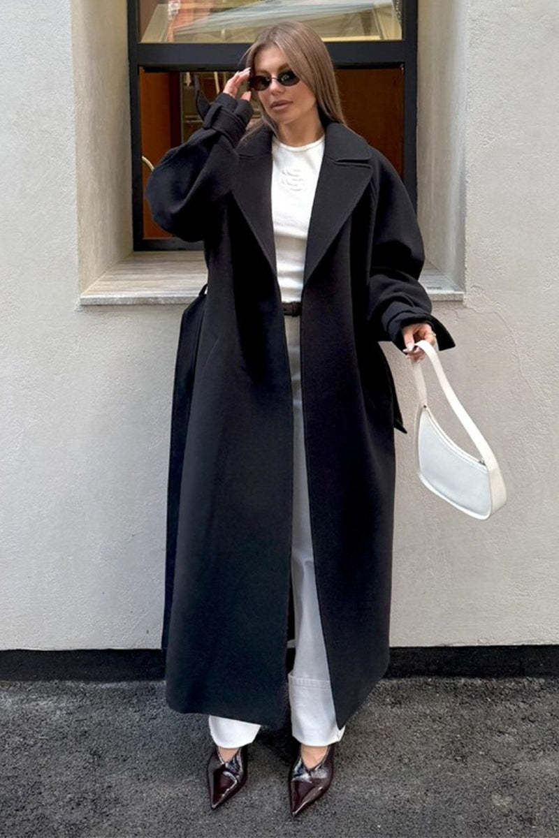 Longline Wool Blend Tie Waist Loose Elegant Overcoat