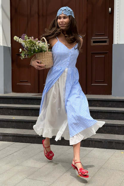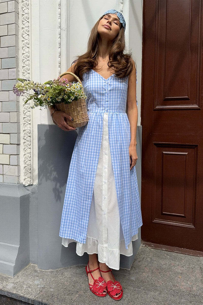 • Combination: Fake Two-Piece • Clothing Type: A-line Dress • Dress Length: Maxi • Waist Type: High Waist • Neckline: V-Neck • Details: Plaid • Composition: Polyester