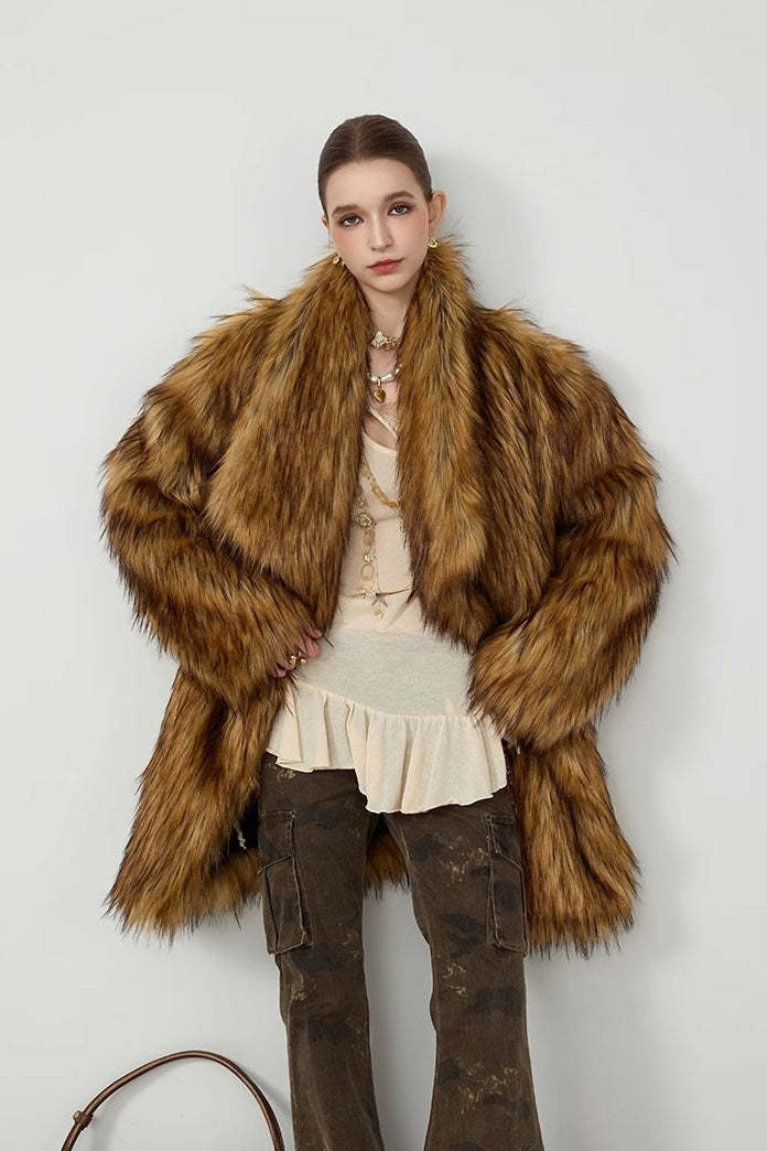 • Neckline: Lapel Collar • Sleeve Type: Regular sleeve • Sleeve Length: Long Sleeve • Details: Mid-Length, Solid Color • Composition: Faux Fur