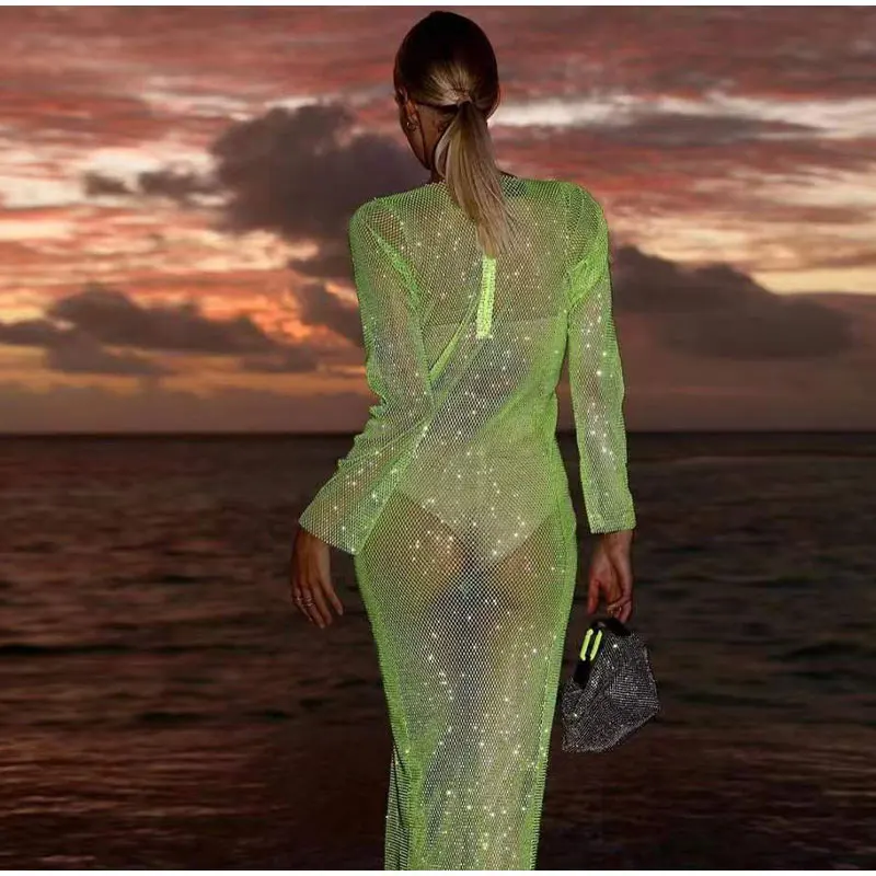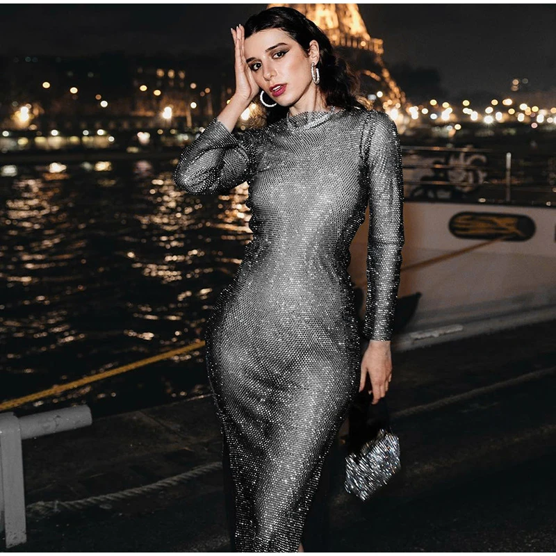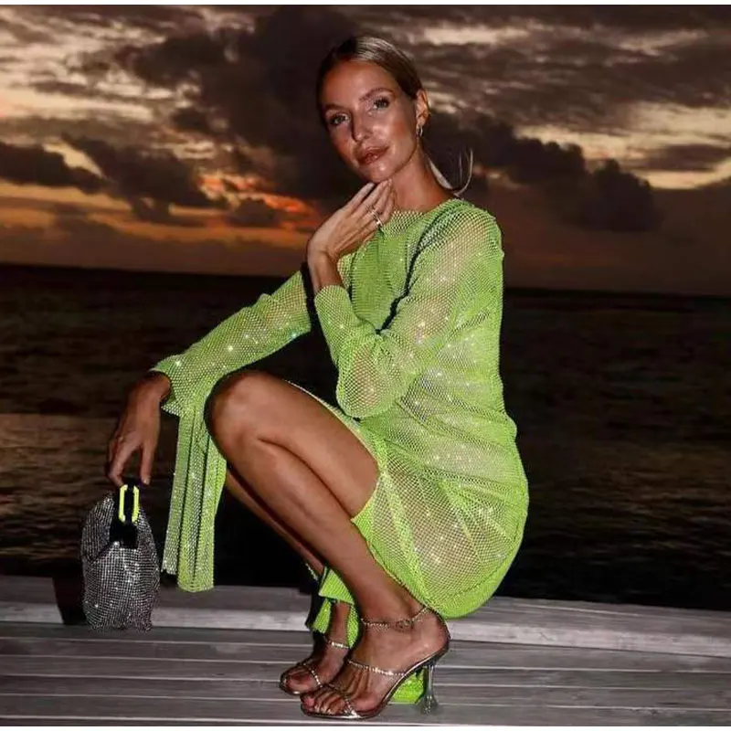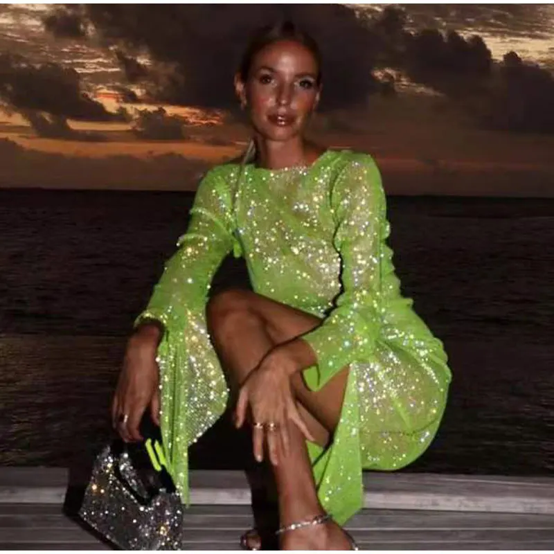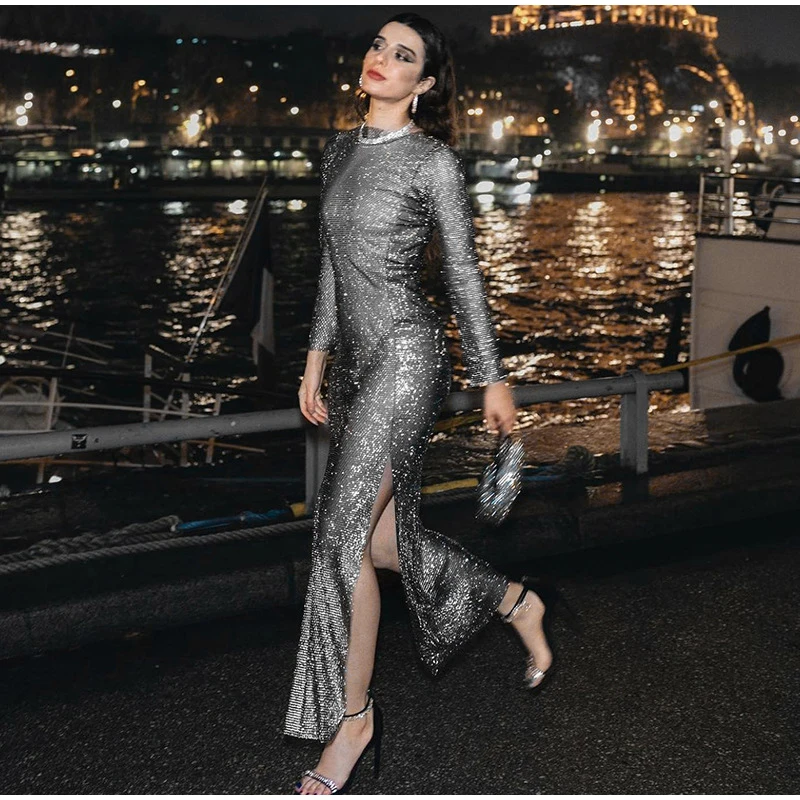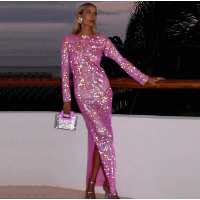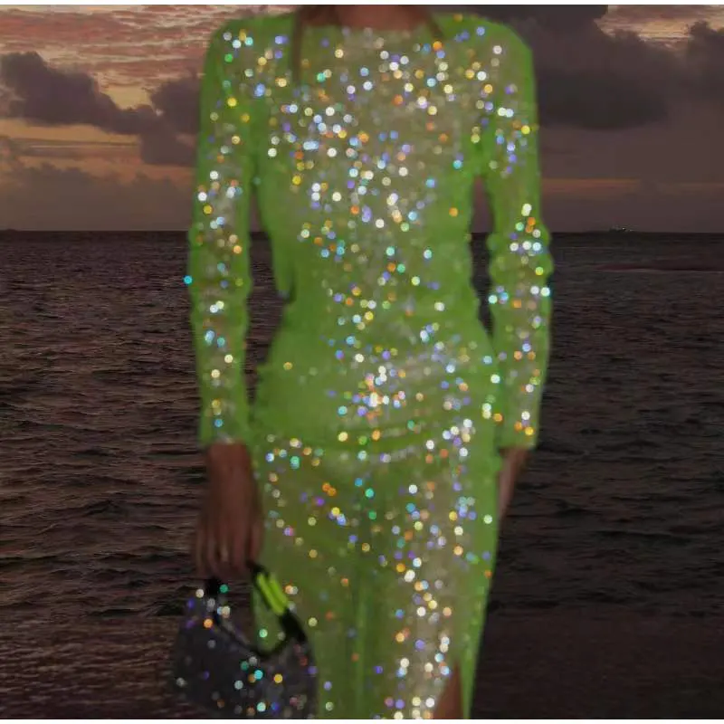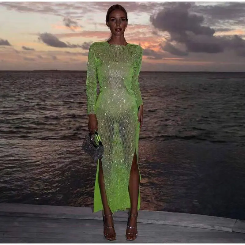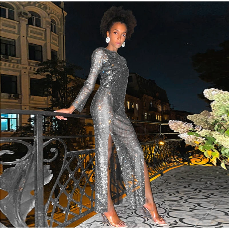 Long Sleeve Split O Neck Slim Party See Through Dress