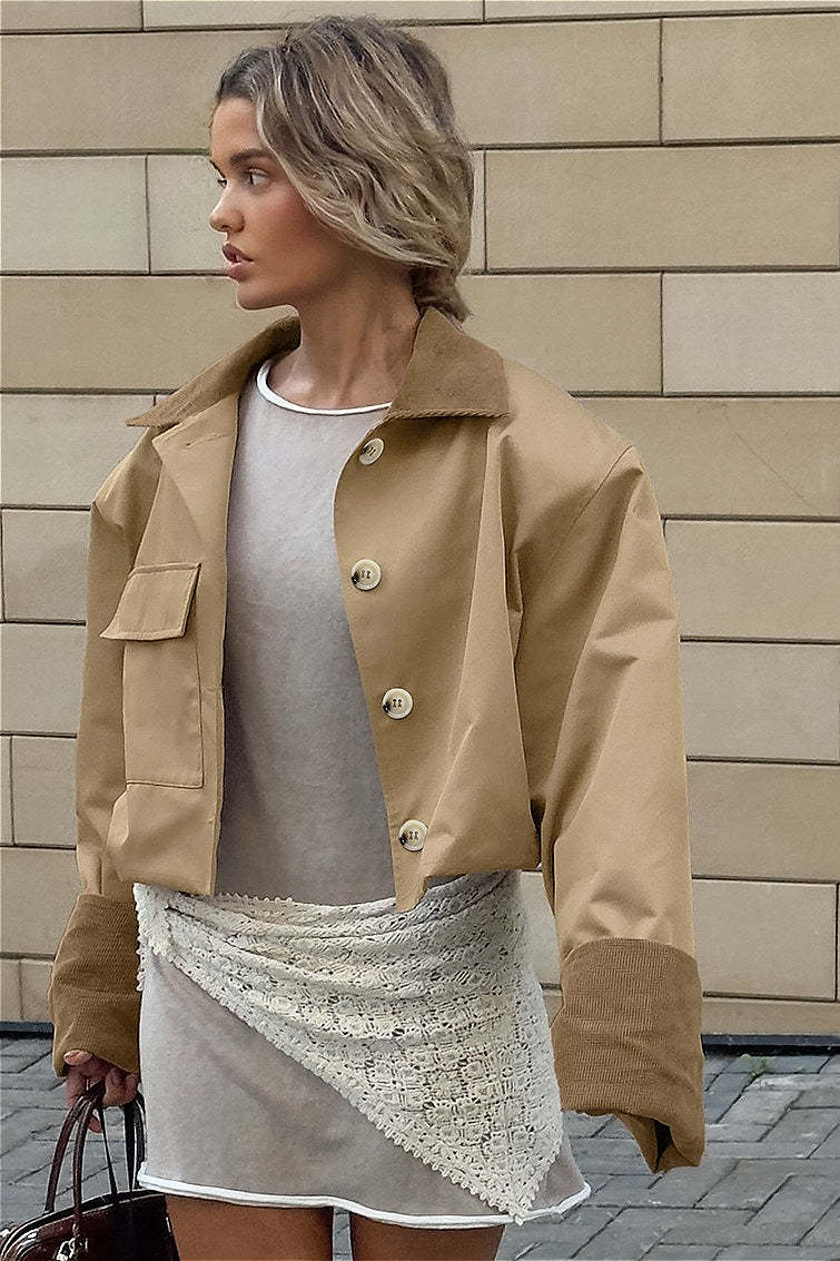 • Fit: Loose Fit • Length: Cropped Length • Neckline: Lapel Collar • Sleeve Type: Regular Sleeve • Sleeve Length: Long Sleeve • Composition: Polyester • Details: Buttons