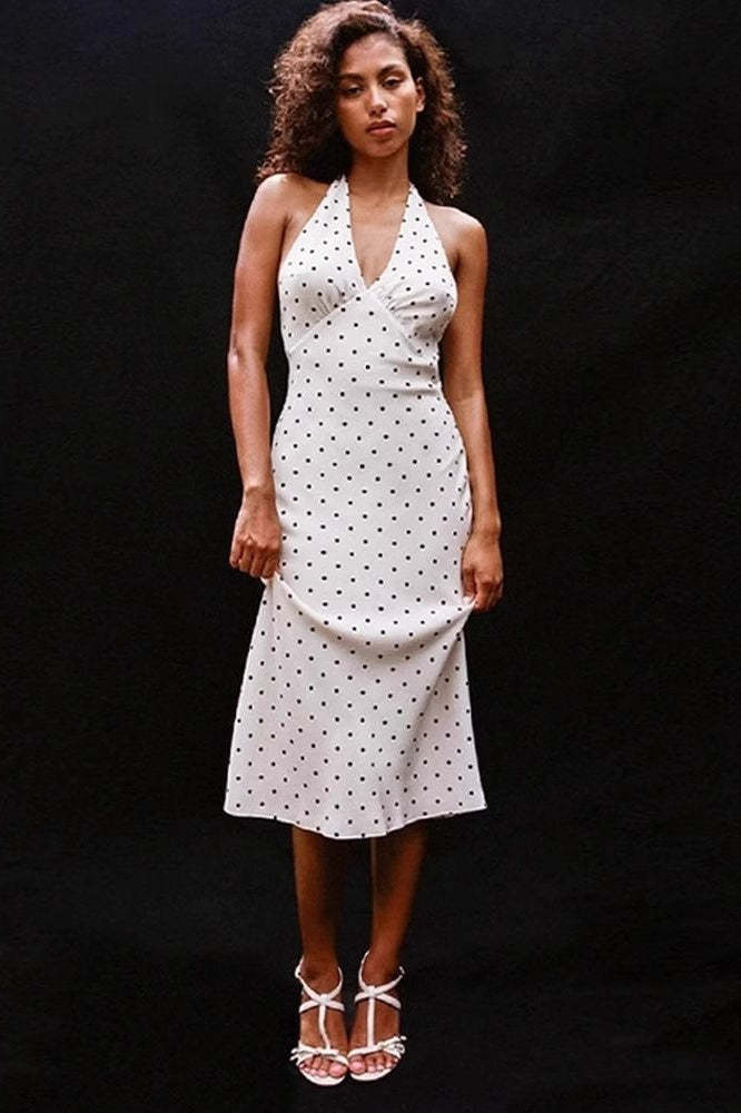 • Clothing Type: Bodycon Dress • Dress Length: Midi • Waist Type: High Waist • Neckline: V-Neck • Details: Polka Dot • Composition: Polyester