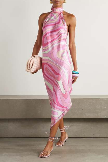 • Clothing Type: Asymmetrical Dress • Dress Length: Midi • Waist Type: High Waist • Neckline: Halter Neck • Sleeve Type: Sleeveless • Sleeve Length: Sleeveless • Composition: Polyester • Details: Halter Neck