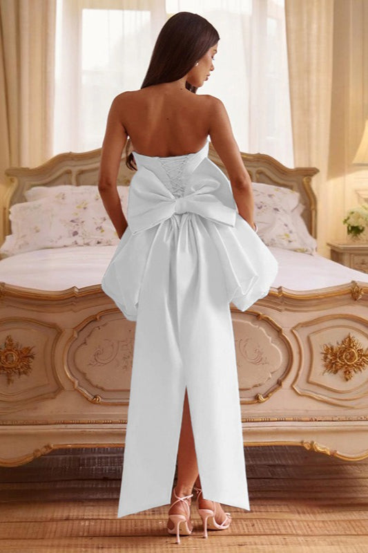 • Clothing Type: A-line Dress • Dress Length: Mini • Waist Type: High Waist • Neckline: Off-The-Shoulder • Details: Bow, Backless • Composition: Spandex