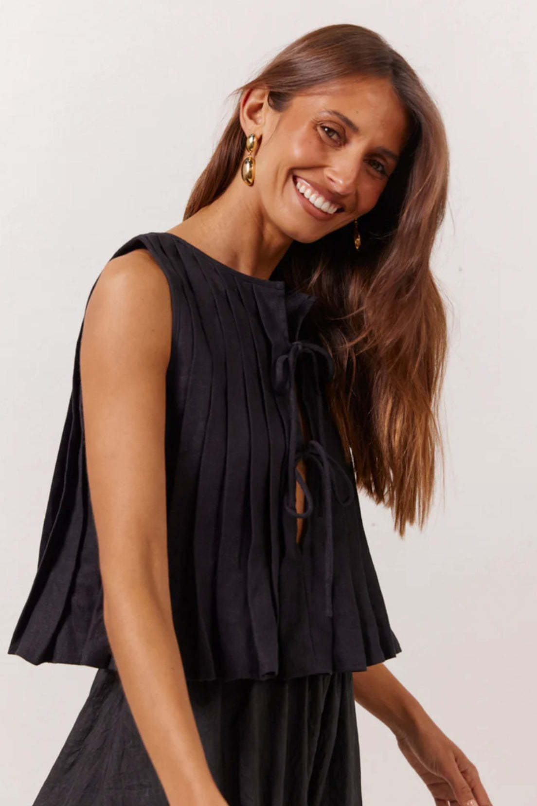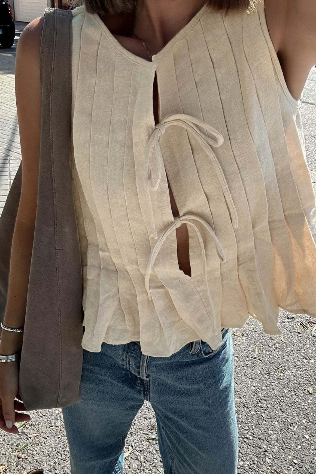 • Fit: Loose Fit • Dress Length: Regular • Neckline: Crew Neck • Sleeve Type: Sleeveless • Sleeve Length: Sleeveless • Composition: Cotton, Linen • Details: Drawstring, Ruching