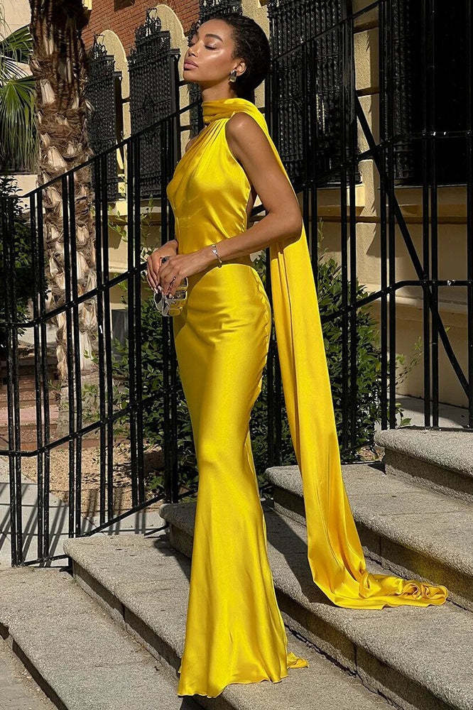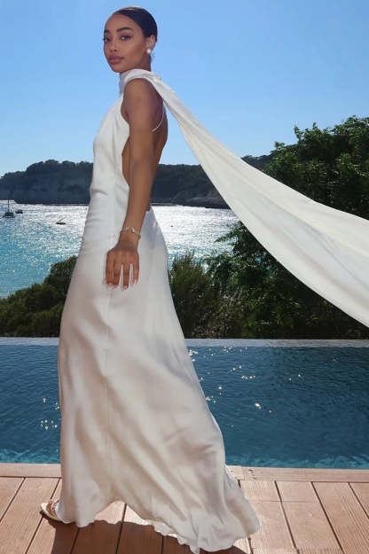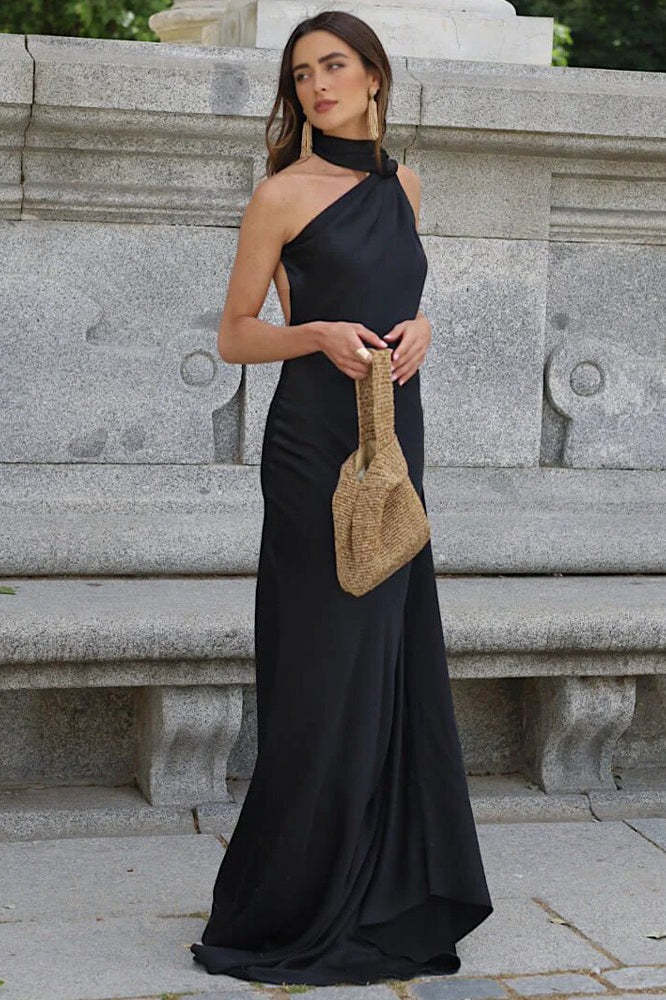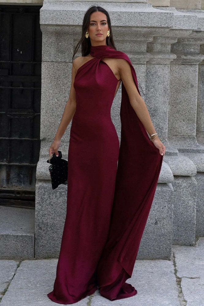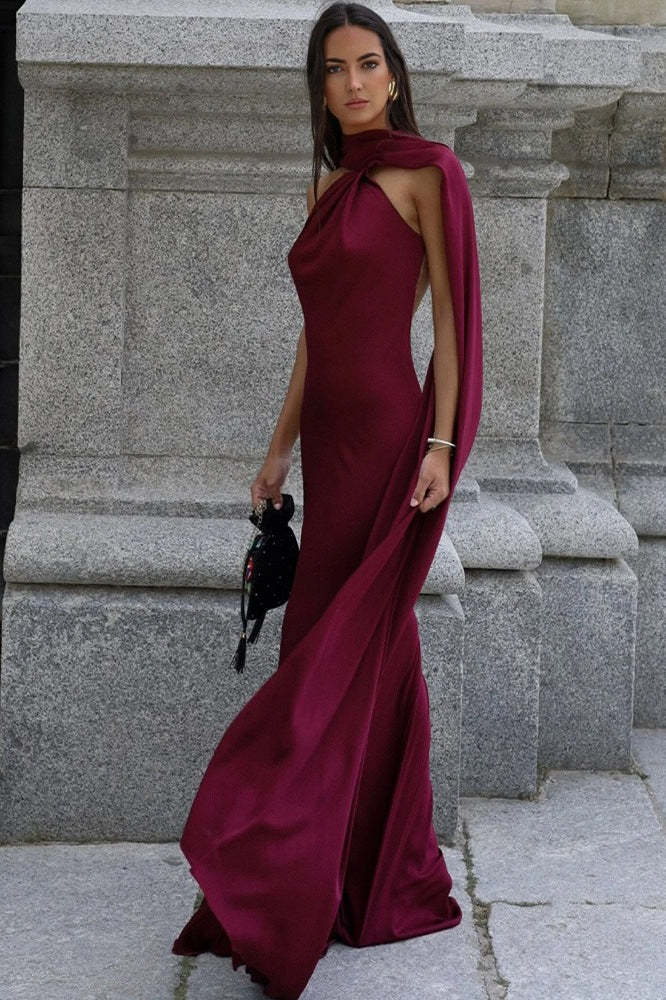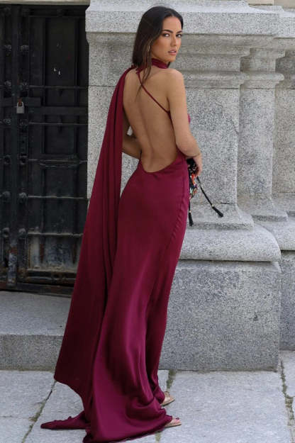 • Fit: Slim Fit • Clothing Type: High Waist Dress • Dress Length: Maxi • Waist Type: High Waist • Neckline: Scarf Collar • Composition: Polyester • Details: Backless, Streamer