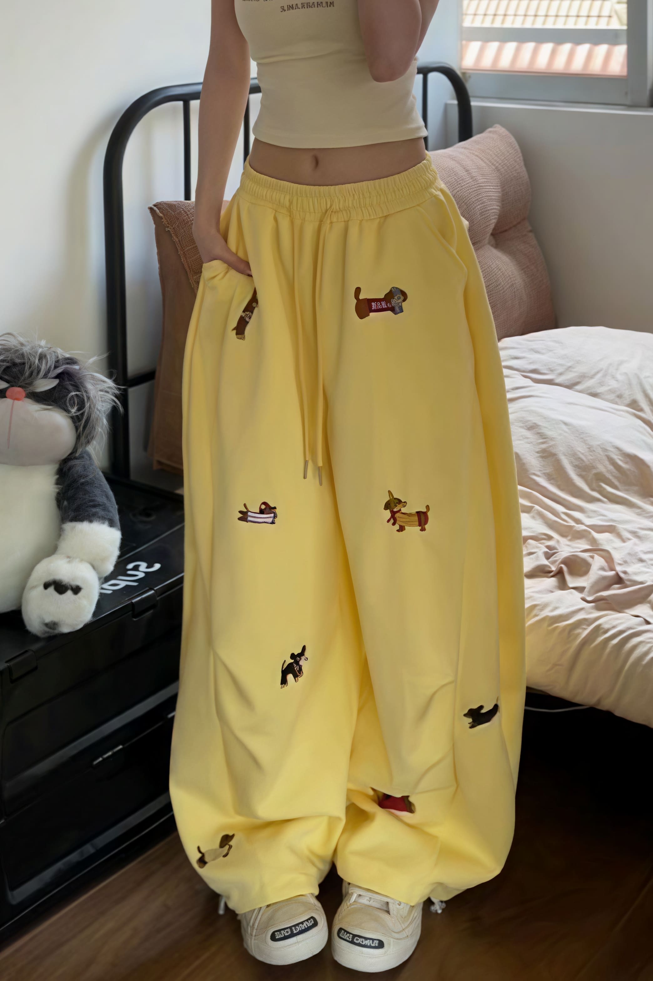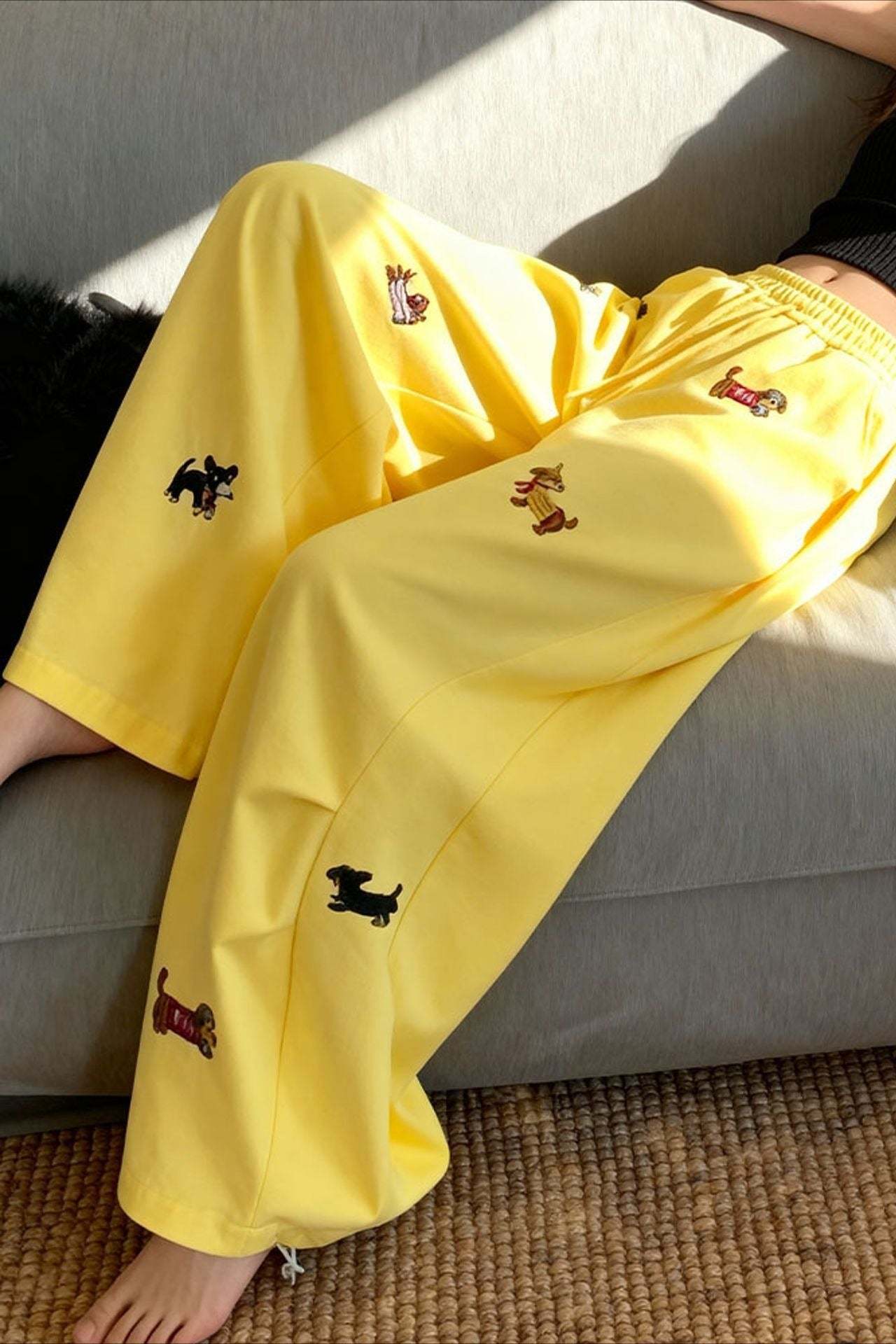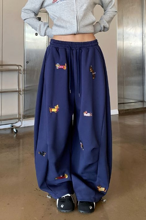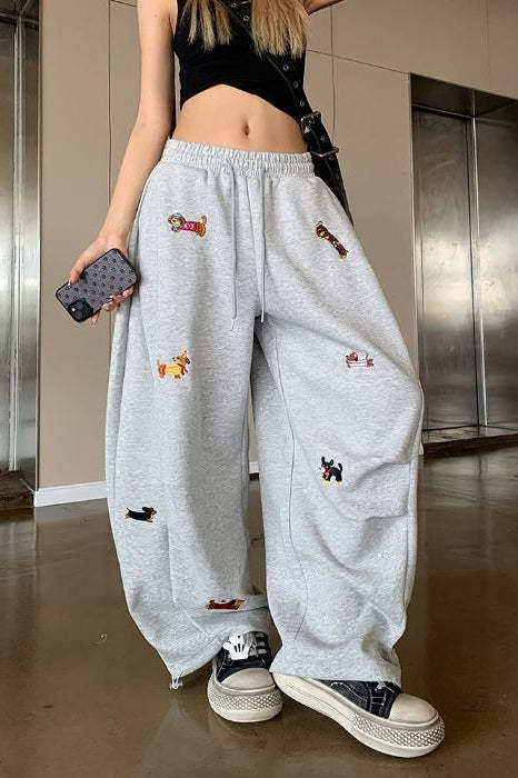 • Clothing Type: Wide Leg Pants • Waist Type: Elastic Waist • Details: Embroidery • Composition: Others • Elasticity: Slight Stretch