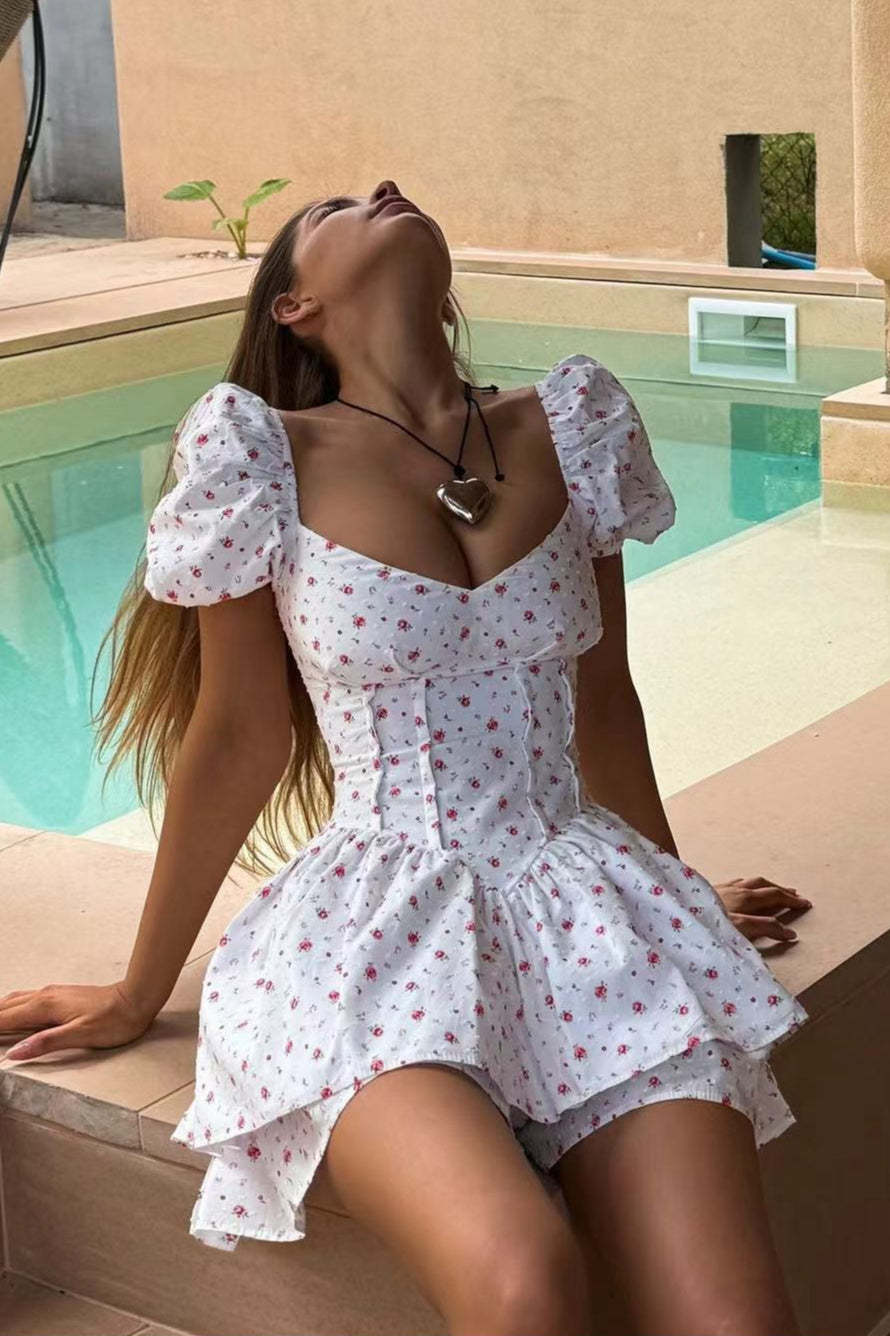 • Clothing Type: A-line Dress • Dress Length: Mini • Waist Type: Mid Waist • Neckline: V-Neck • Sleeve Length: Short Sleeve • Sleeve Type: Puff Sleeve • Details: Floral Print • Composition: Polyester
