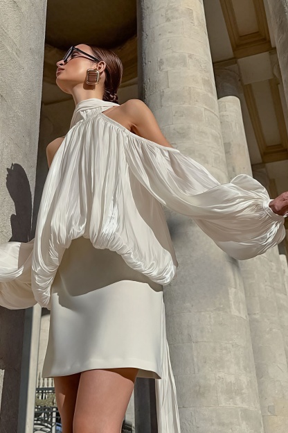 • Fit: Loose Fit • Neckline: Scarf Collar • Sleeve Type: Puff Sleeve • Sleeve Length: Long Sleeve • Details: Buttons, Lurex Thread • Composition: Polyester, Lurex