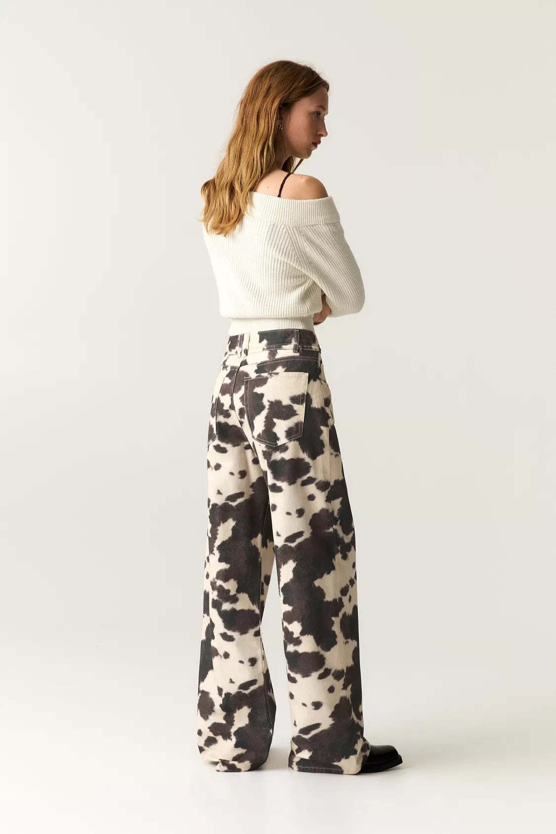 • Fit: Straight-leg• Waist Type: High Waist• Details: Distressed, Cow Print• Composition: Denim