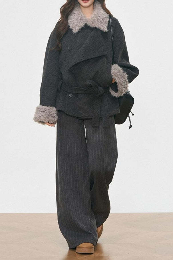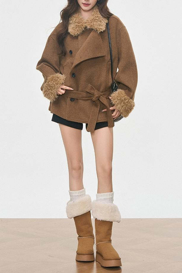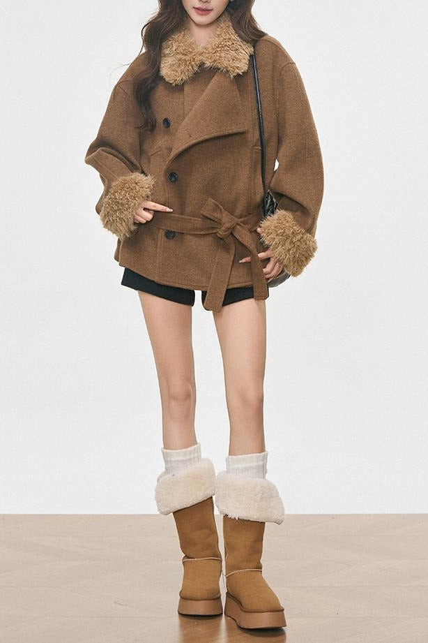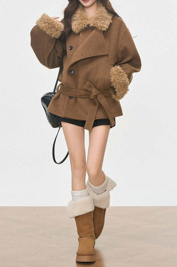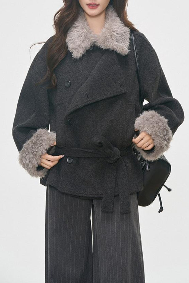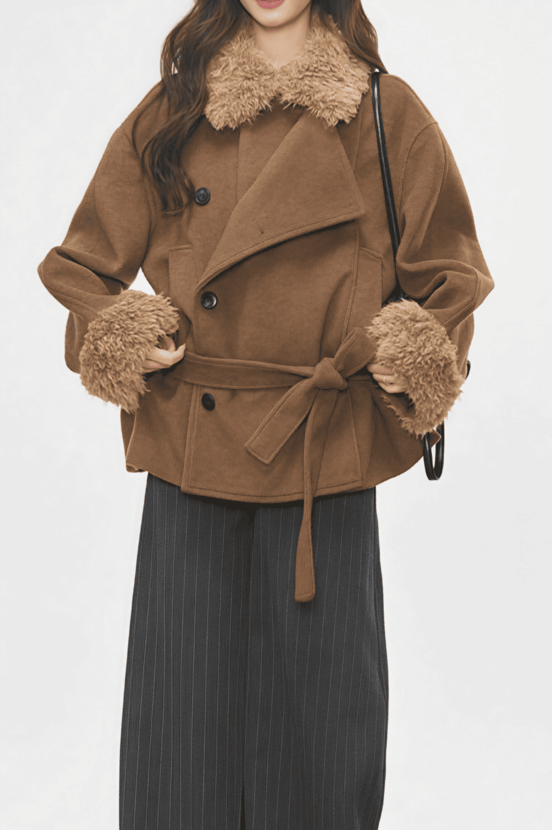 • Fit: Regular Fit • Neckline: Fur Collar • Sleeve Type: Regular sleeve • Sleeve Length: Long Sleeve • Composition: Polyester, Wool • Details: Solid Color, Color Blocking