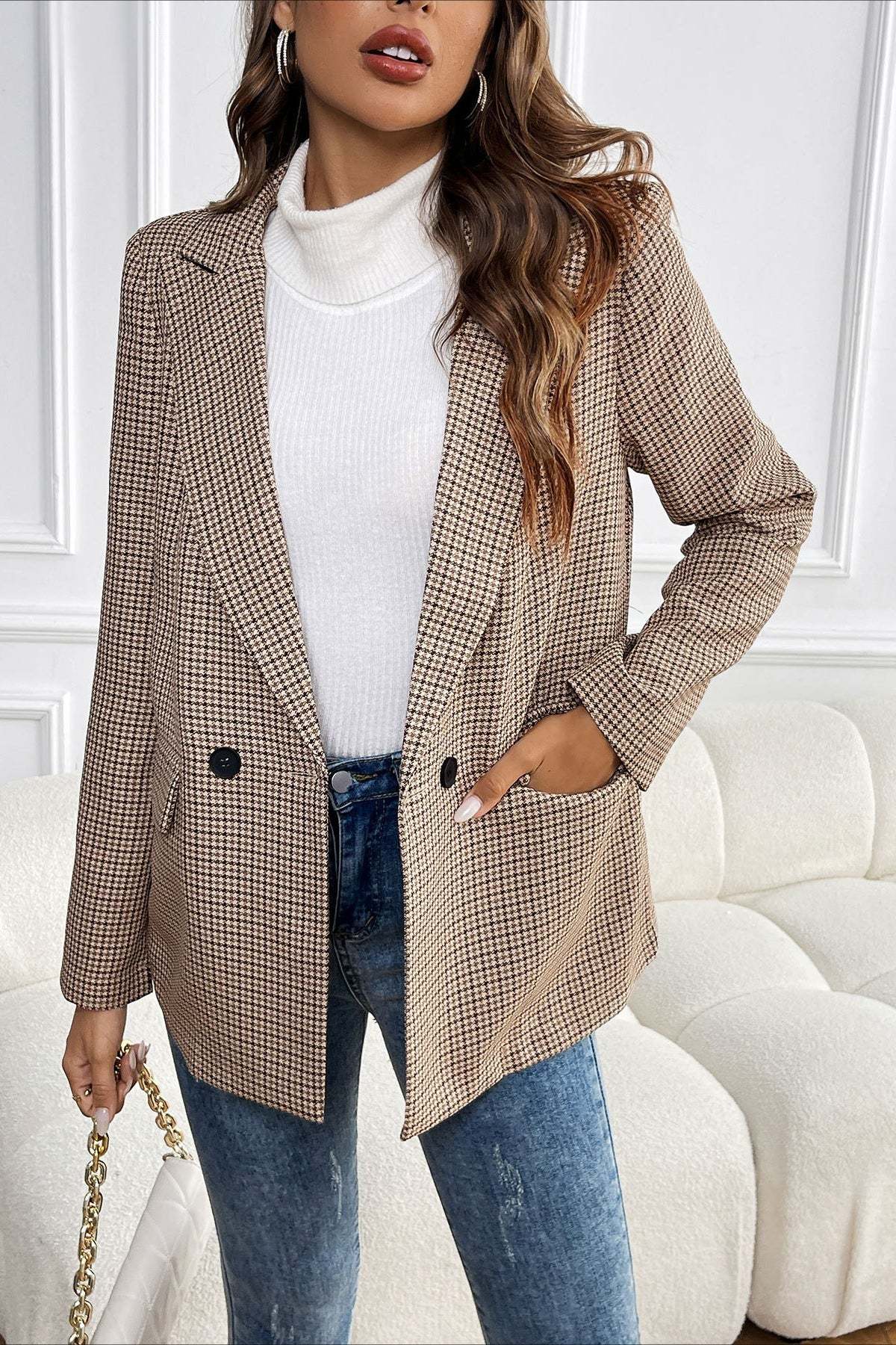 • Fit: Regular Fit • Neckline: Lapel Collar • Sleeve Length: Long Sleeve • Sleeve Type: Regular sleeve • Details: Houndstooth • Composition: Polyester