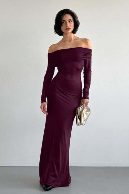 • Clothing Type: Bodycon Dress • Dress Length: Maxi • Waist Type: High Waist • Neckline: Off-The-Shoulder • Sleeve Type: Regular sleeve • Sleeve Length: Long Sleeve • Composition: Cotton, Spandex • Details: Open Back