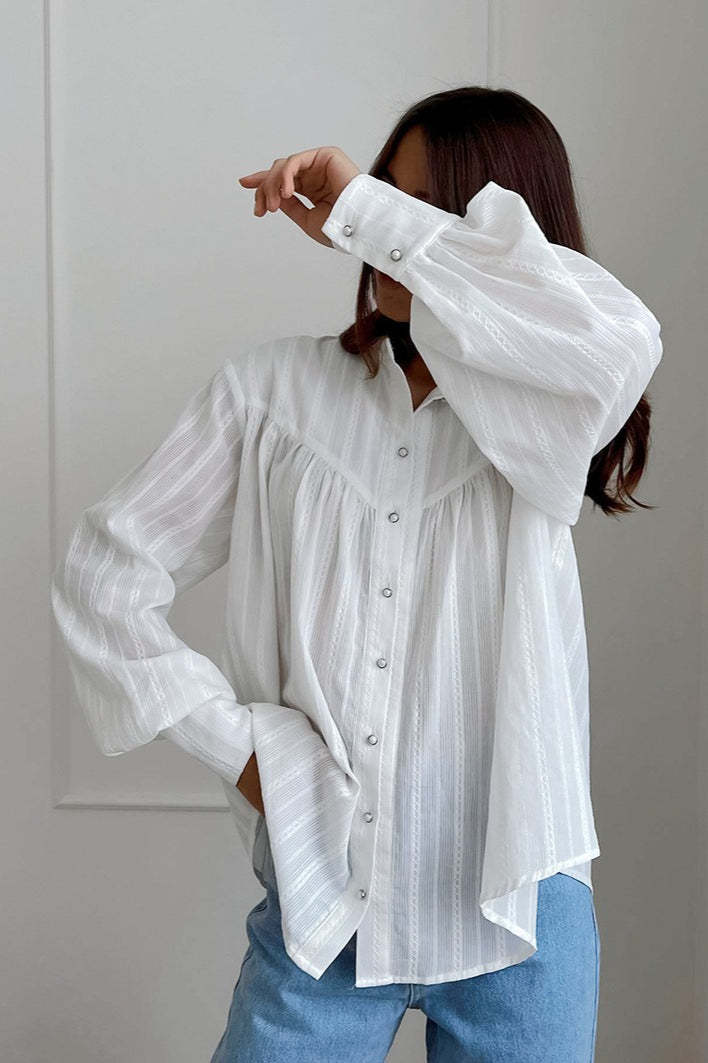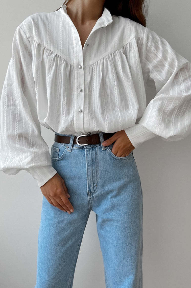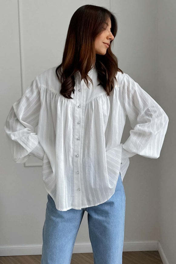 • Fit: Loose Fit • Neckline: Stand Collar • Sleeve Type: Puff Sleeve • Sleeve Length: Long Sleeve • Details: Buttons • Composition: Cotton